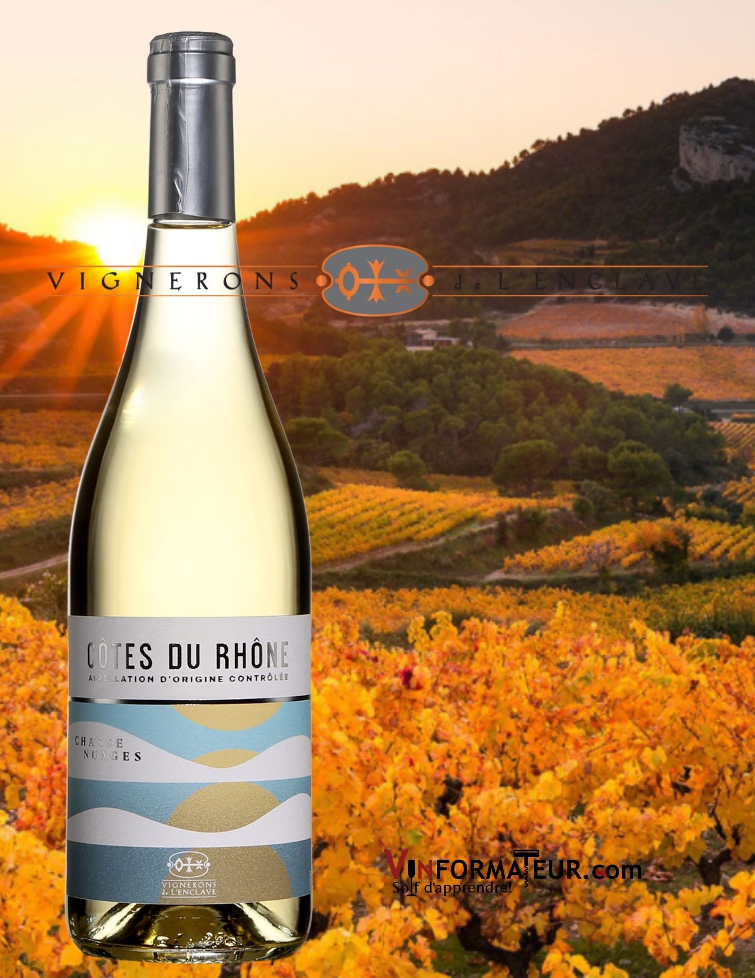 Chasse Nuages, Côtes du Rhône, vin blanc, Les Vignerons de l’Enclave, 2019, 16,20$, cépages: Viognier 50 %, Grenache blanc 50 %, sucre : 1.3 g/l, alc. : 14%, code SAQ : 14737775.