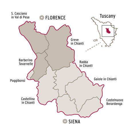Les capitales du territoire du Chianti Classico sont Sienne et Florence et sont partagées entre les provinces des deux municipalités. La zone s’élève à 71 800 hectares (177 500 acres) et comprend l’ensemble des territoires des municipalités de Castellina in Chianti, Gaiole in Chianti, Greve in Chianti et Radda in Chianti et des parties de celles de Barberino Tavarnelle, Castelnuovo Berardenga, Poggibonsi, San Casciano Val di Pesa.