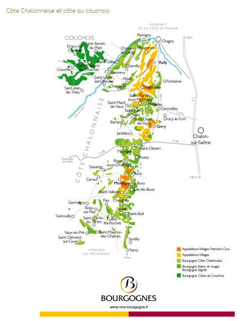 Côte Chalonnaise et Couchois offrent diverses Appellations Régionales telles : Bourgogne blanc ou rouge, Bourgogne Aligoté, Bourgogne Passe-tout-grains et Coteaux Bourguignons.