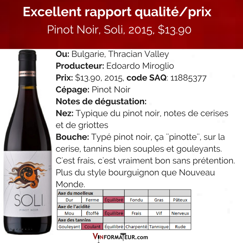 Pas mal bon ce Pinot Noir de Bulgarie, Le Soli, Thracian Valley, Edoardo Miroglio, $13.90, 2015, code SAQ: 11885377