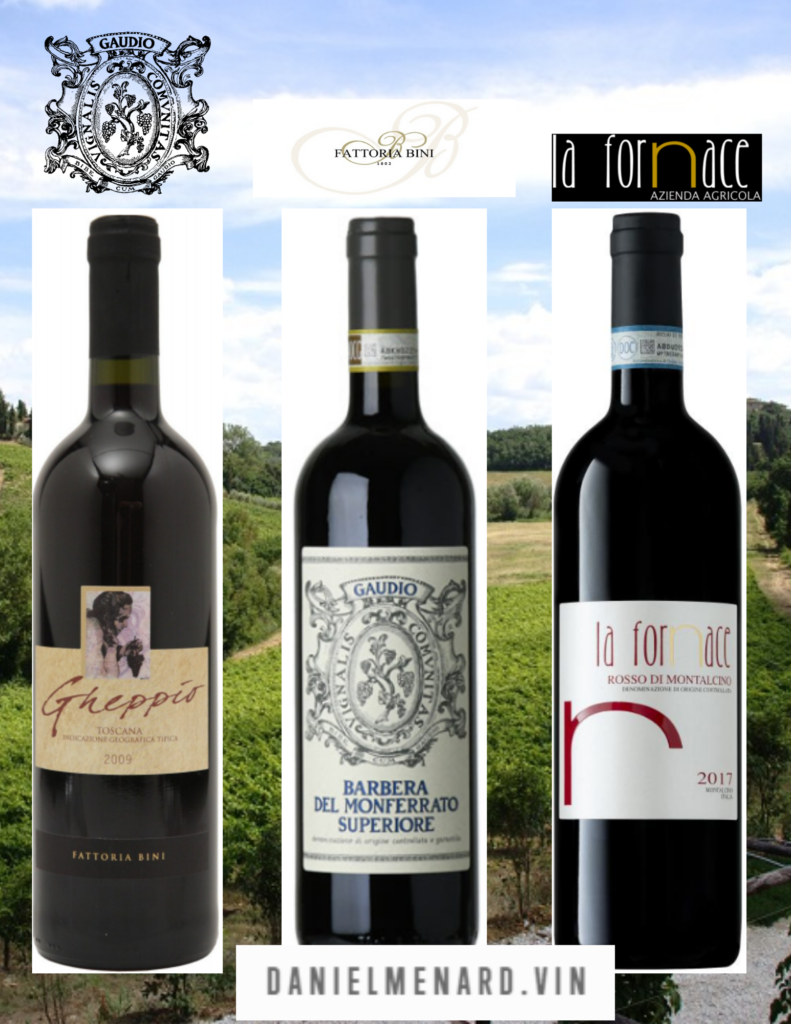 Je vous suggère 3 vins d’Italie de régions parmi les plus qualitative soient la Toscane (Gheppio) incluant l’appellation Rosso di Montalcino (La Fornace) ainsi que le Piedmont avec un Barbera del Monteferranto Superiore (Gaudio).