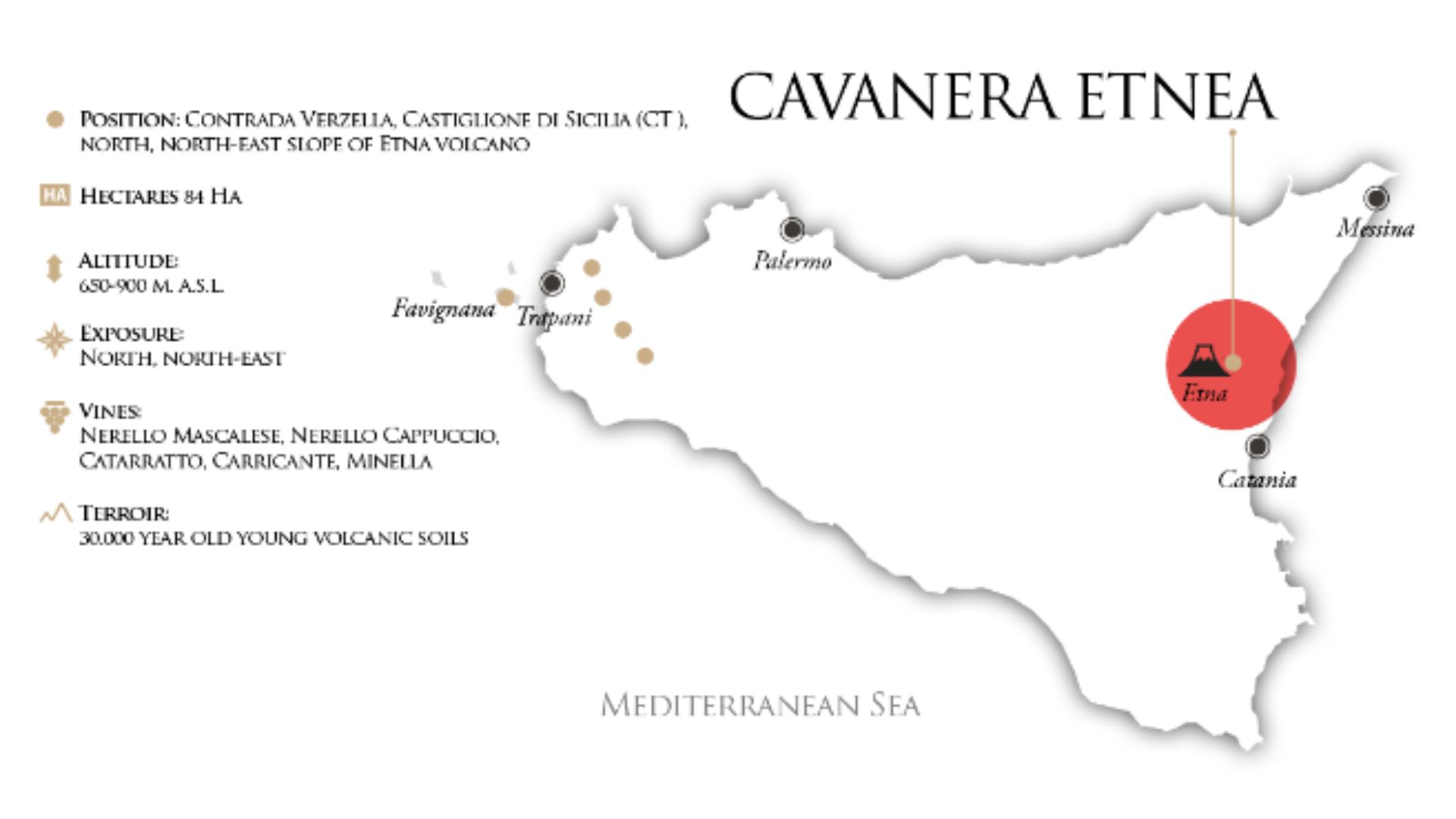 Ce vin a été élaboré par la maison Firriato dans leur domaine Cavanera Etnea qui situé sur le versant nord-est du volcan Etna. Il s’agit d’une zone caractérisée par son sol limoneux jeune, à prédominance sableuse, qui a une capacité de drainage élevée et une teneur en minéraux.