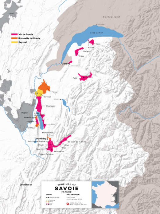 La Savoie c’est 3 AOC régionales (Savoie, Roussette de Savoie et Seyssel) et 20 dénominations géographiques réparties sur 2,100 ha situés à l’est entre le Beaujolais et la Côte du Rhône septentrionale.