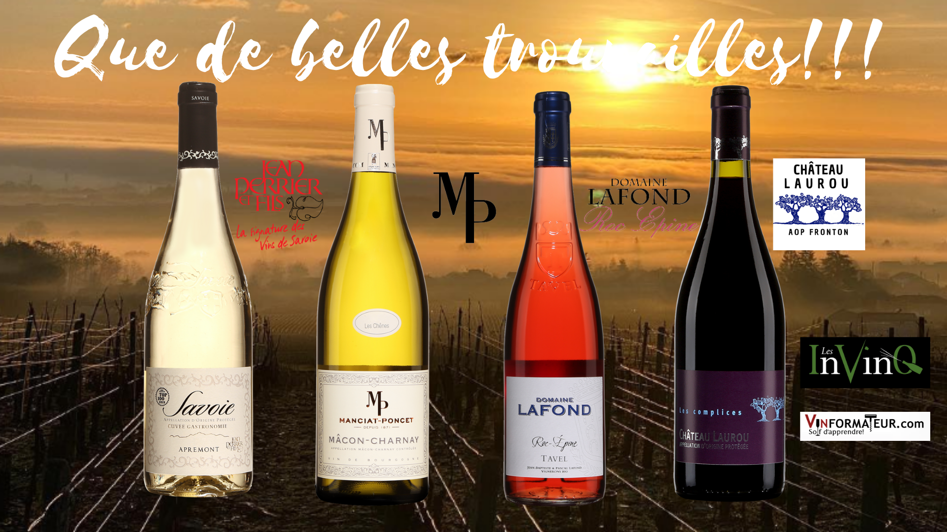 Quelles belles trouvailles que je vous ai dénichées dans les terroirs de la France! Tant en Savoie que dans le Mâconnais appellation Mâcon-Charnay avec deux vins blancs, dans les Côtes du Rhône appellation Tavel avec un vin (rosé – mais il ne faut pas le dire…) et un vin rouge du Sud-Ouest de l’appellation Fronton.
