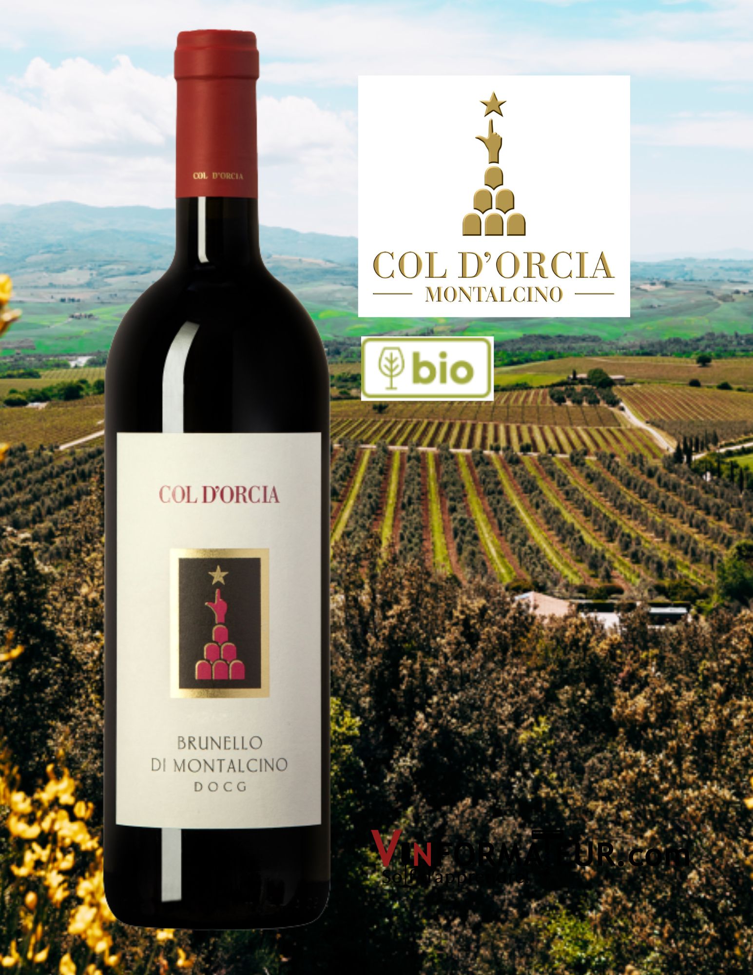 La maison Col dOrcia signifie littéralement la colline surplombant la rivière Orcia. Cette rivière Orcia marque la frontière sud-ouest du territoire de Brunello di Montalcino et le nom de la ferme est lié à l’emplacement où les vignes sont plantées. Ce domaine est la plus grande ferme viticole biologique de toute la Toscane et ce depuis 2010.