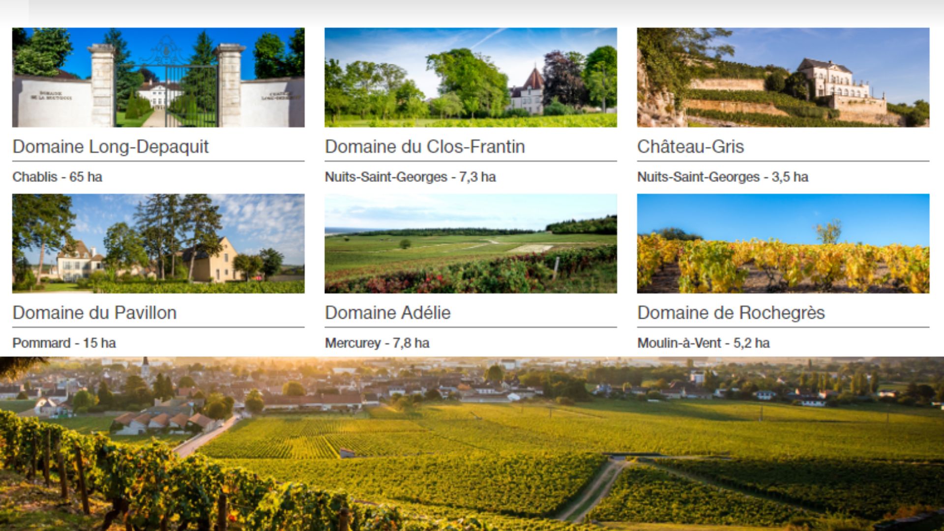 Le patrimoine viticole de la maison va également s’agrandir jusqu’à atteindre 6 domaines sur 100 ha de vignes (13 en Grands Crus et 26 en Premiers Crus) du nord au sud de la Bourgogne : Domaine Long-Depaquit à Chablis, Domaine du Clos-Franquin à Nuits St-Georges, Château-Gris à Nuits-St-Georges, Domaine du Pavillon à Pommard, Domaine Amélie à Mercurey et Domaine de Rochegrès en Beaujolais appellation cru Moulin-à-Vent.