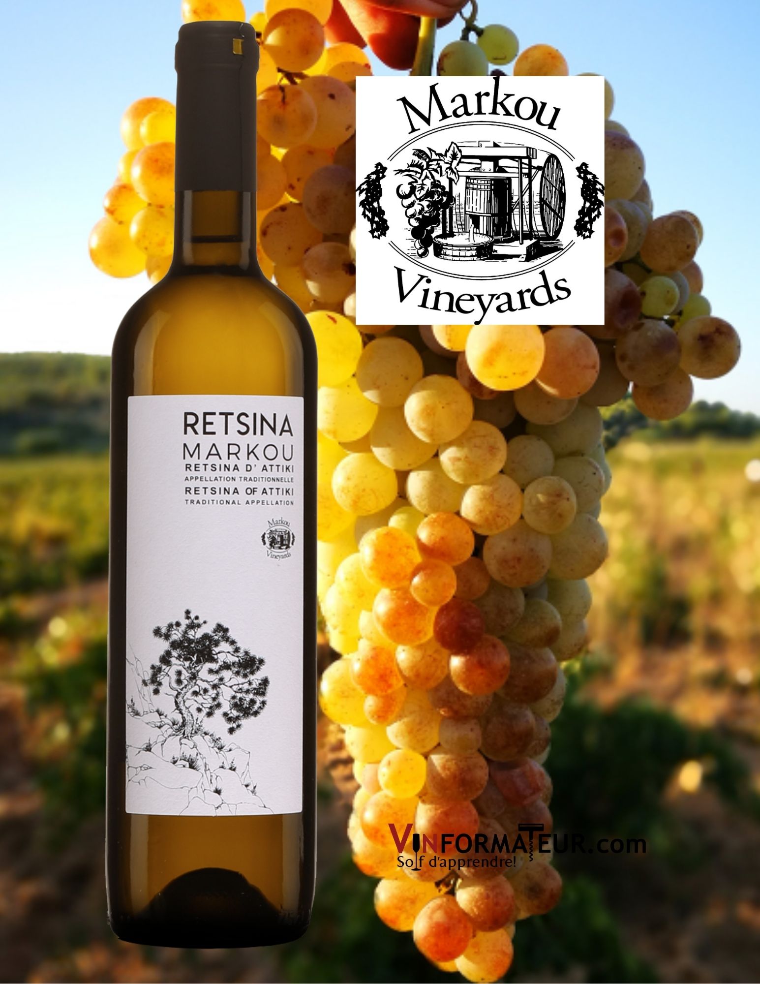 Retsina, Markou Vineyards, Grèce, Retsina d’Attiki, Epitrapezios inos (VDT), vin blanc, 16,40$, cépage : Savatiano 100 %, sucre : 1.7 g/l, alc. : 12%, code SAQ : 14388552.