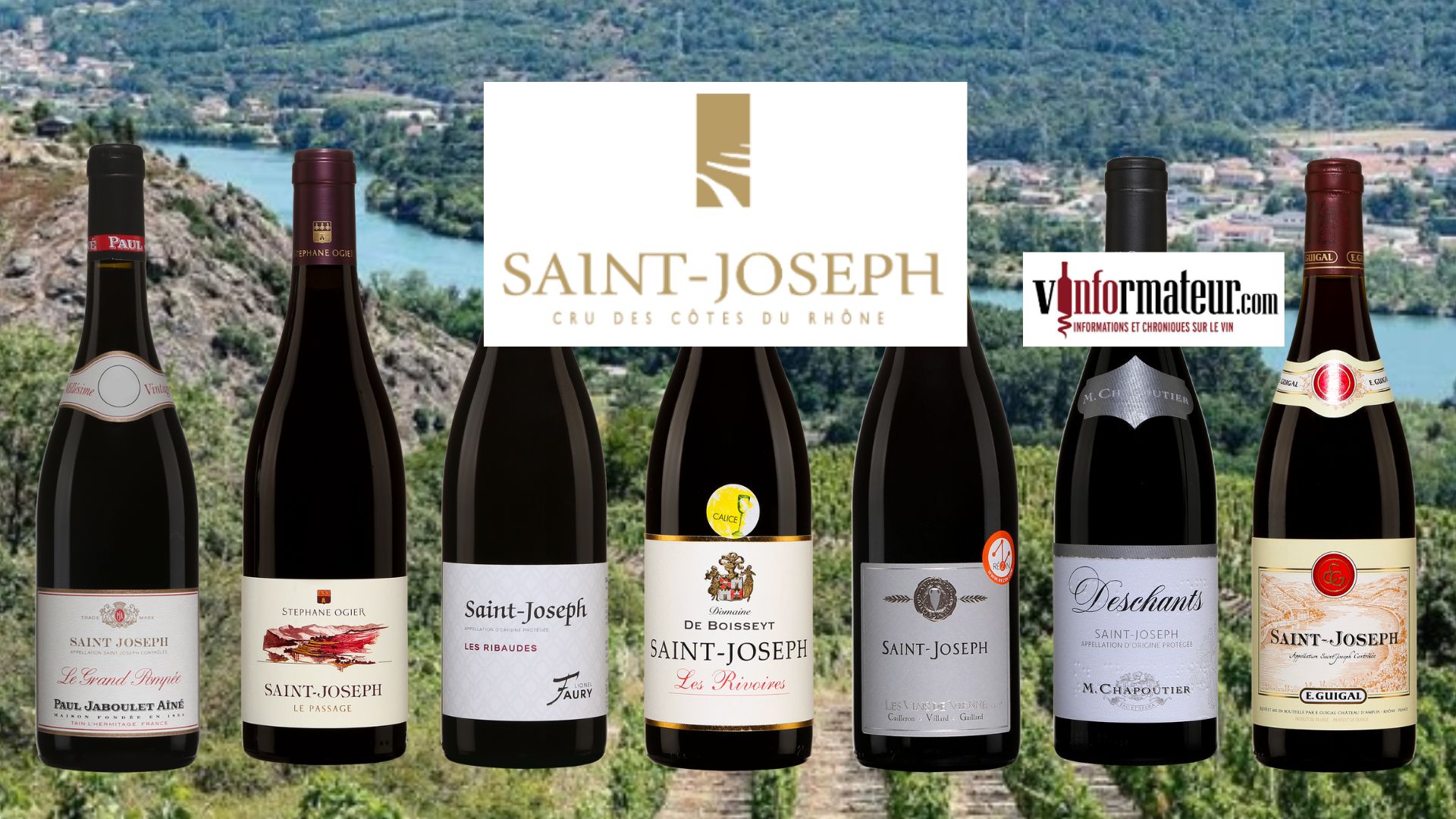 Les vins de l’appellation Saint-Joseph: M. Chapoutier, E. Guigal, Yves Cuilleron, Pierre Gaillard, Vins de Vienne, Paul Jaboulet, Stéphane Ogier, Lionel Faury, Vignoble de Boisseyt.