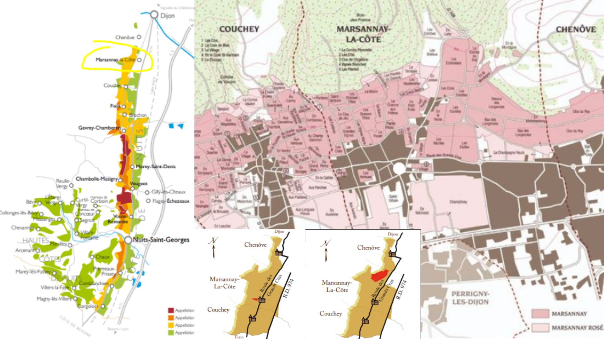 En fait, Marsannay est considérée comme la porte d’Or de la Côte de Nuits. Elle est composée de 3 communes avec Marsannay-la-Côte, Couchey et Chenôve. Le nom de l’appellation peut être suivi par le nom du Climat dans l’attente d’un classement des Climats en Premier Cru.