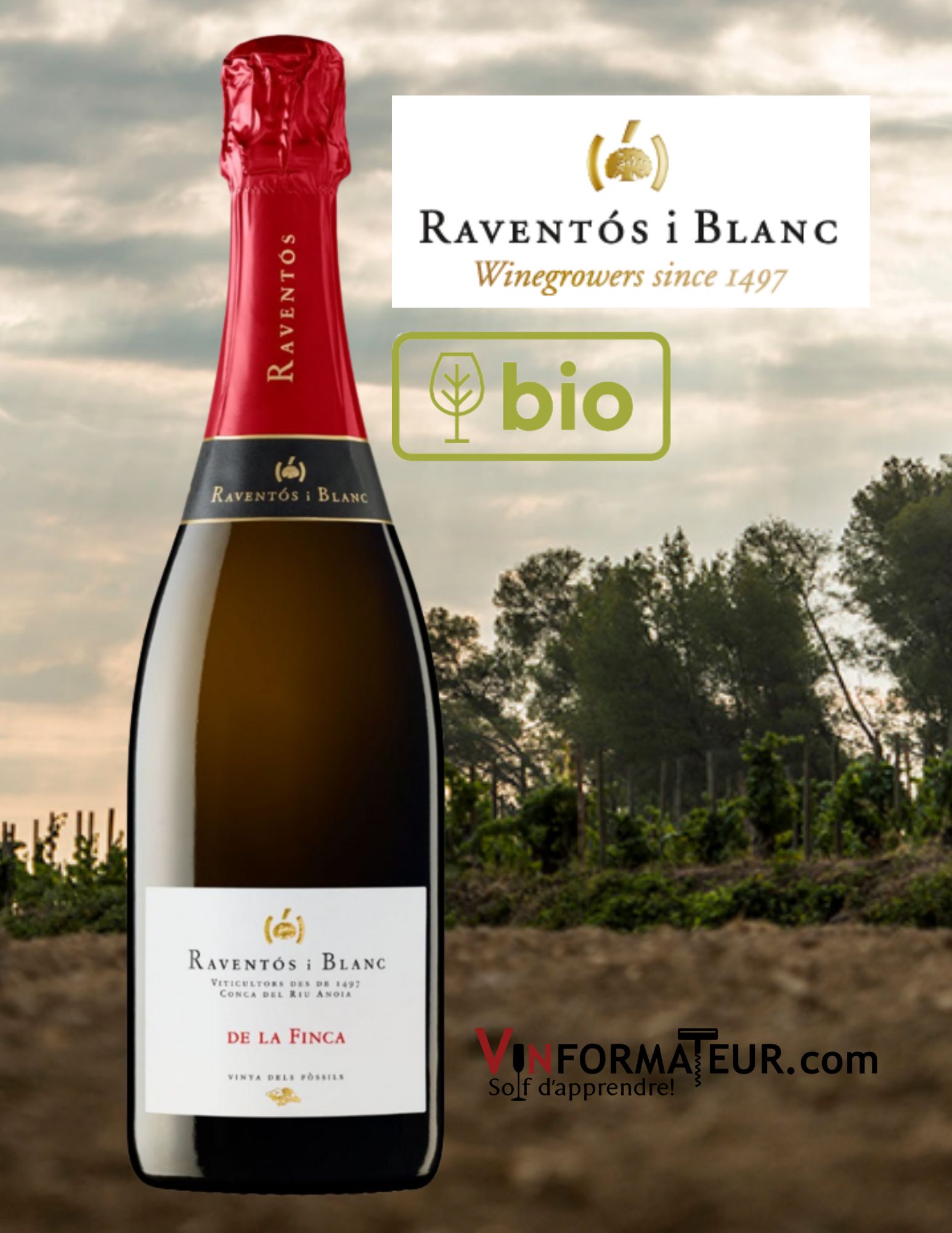 Raventos I Blanc, De la Finca Brut, Conca del Riu Anoia, Espagne, vin mousseux , Bio, 2019, 39,00$, cépages : Xarel-lo 40%, Maccabeu 25%, Parellada 20%, Chardonnay 15%, alc. : 12%, code SAQ : 12178834.