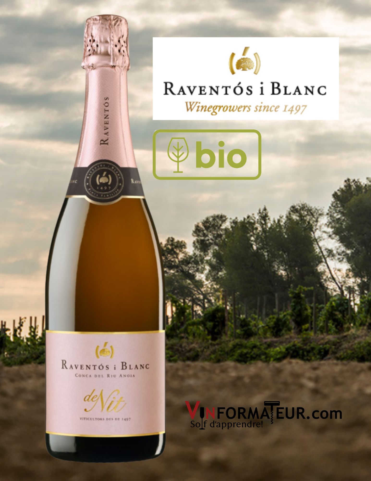 Raventos I Blanc, De Nit, Conca del Riu Anoia, Extra Brut, Espagne, vin mousseux rosé, Bio, 2020, 28,75$, cépages : Maccabeu 50%, Xarel-lo 25%, Parellada 20%, Monastrell 5%, sucre : 4.1 g/l, alc. : 12%, code SAQ : 12097954.