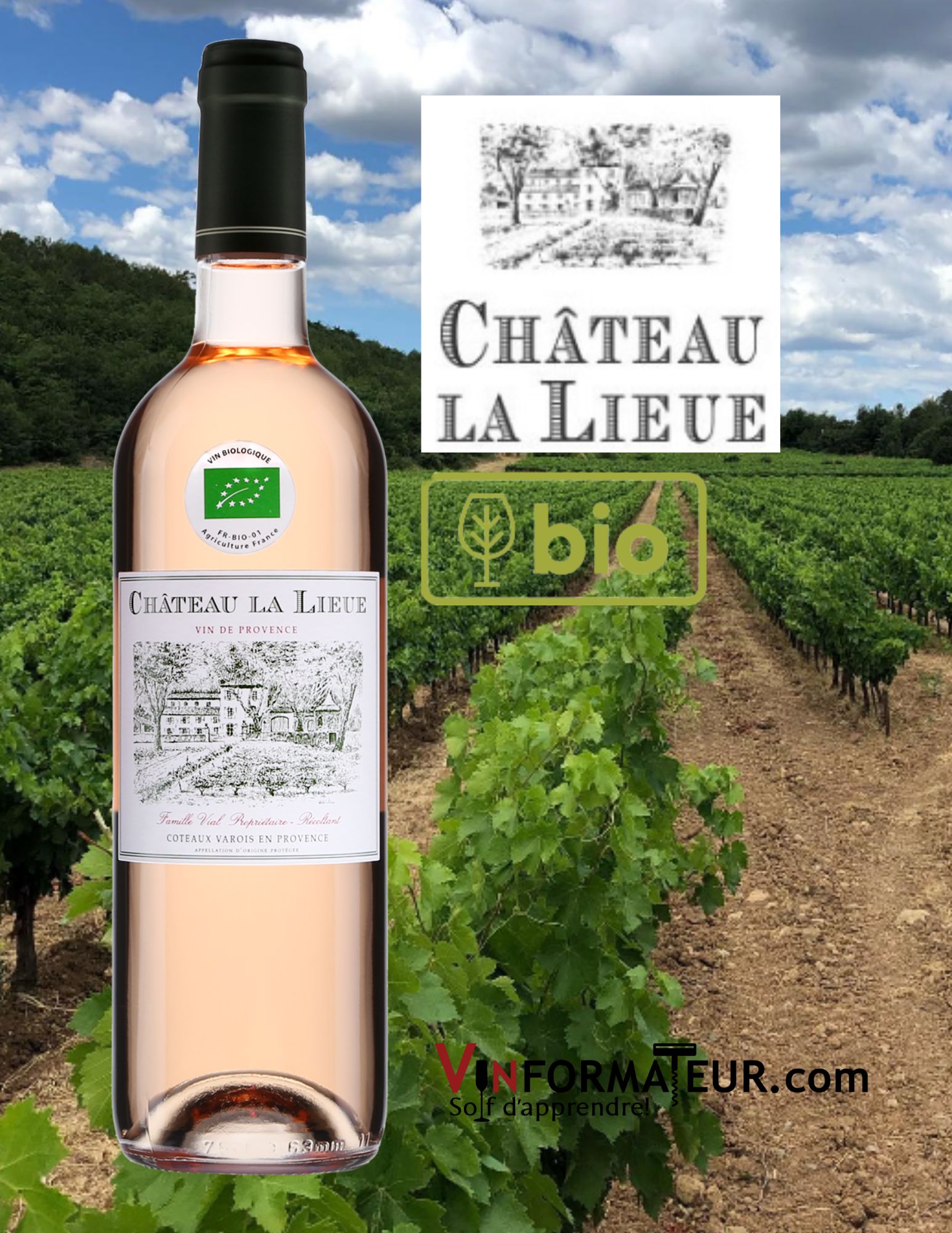 Château La Lieue, Tradition, Coteaux Varois en Provence, vin rosé bio, 2021, 19,20$, cépages : Cinsault 70 %, Grenache 30 %, sucre : moins de 1.2 g/l, alc. : 13%, code SAQ : 11687021.