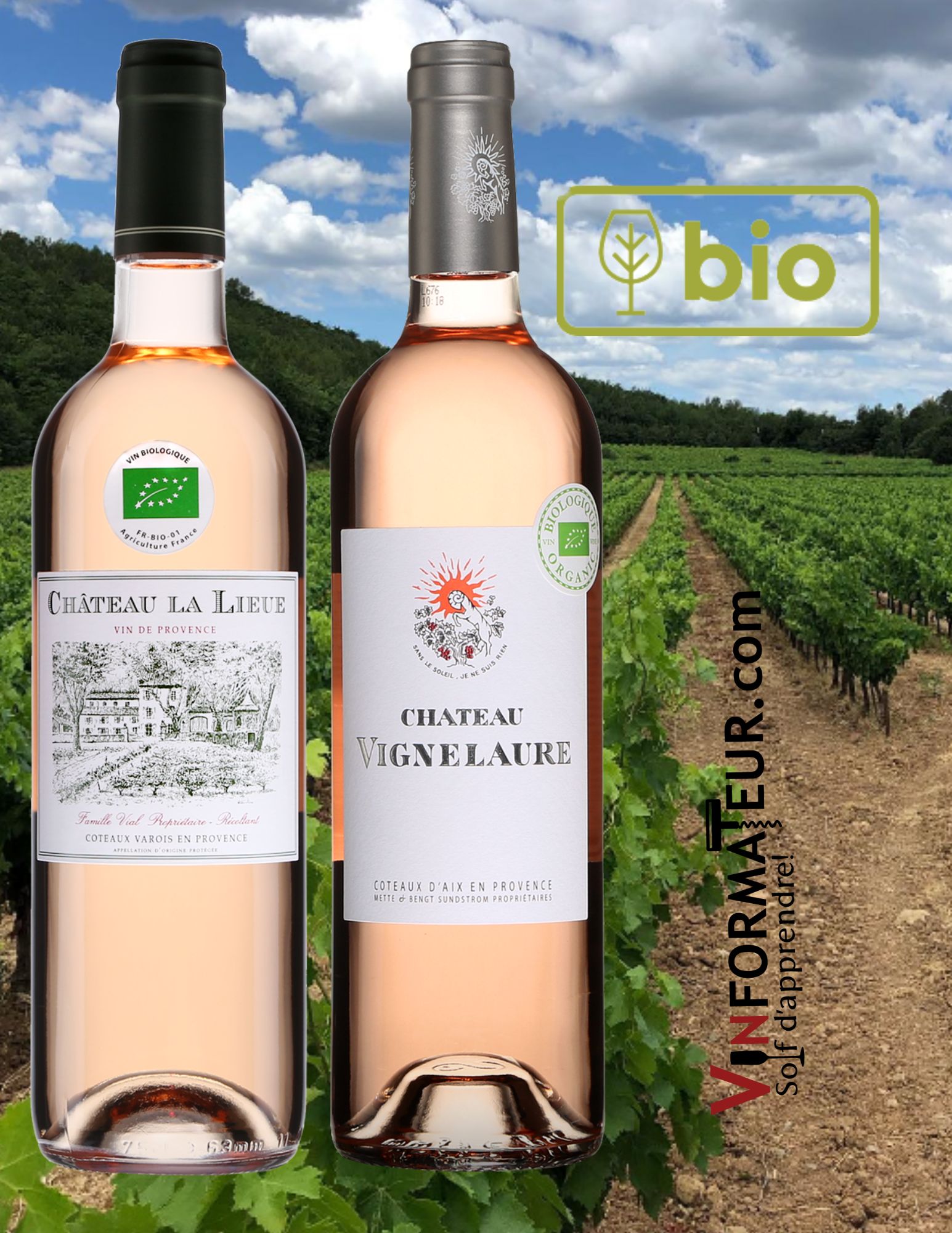 Et voici deux vins rosés bio de gastronomie avec lesquels vous saurez faire la fête! Château La Lieue de Coteaux Varois en Provence et Château Vignelaure de Côteaux d’Aix en Provence.