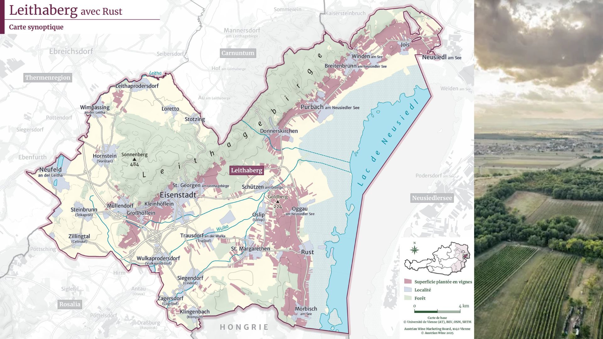 Les vignes s’étendent le long des contreforts orientaux des Alpes, dans un climat continental frais tempéré par le lac de Neusiedl. Les sols — calcaire, loess, argile et schiste micacé — confèrent aux vins des profils minéraux distincts. Des analyses détaillées des sols et une viticulture adaptée à chaque parcelle renforcent la typicité des terroirs.