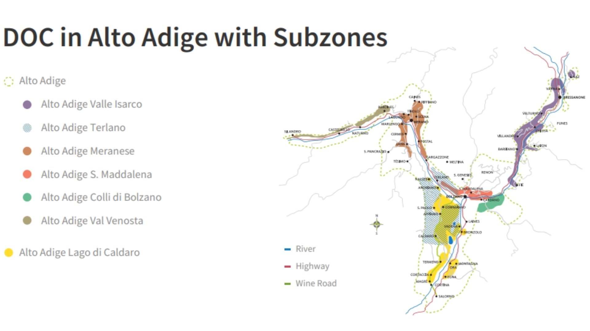 Les deux appellations DOC « Alto Adige » et « Alto Adige Lago di Caldaro » établissent les vins du Alto Adige selon leur origine. La DOC ‘’Alto Adige’’ se décline sous six sous-zones dont Valle Isarco, Santa Maddalena, Terlano, Meranese, Val Venosta et Colli di Bolzano.