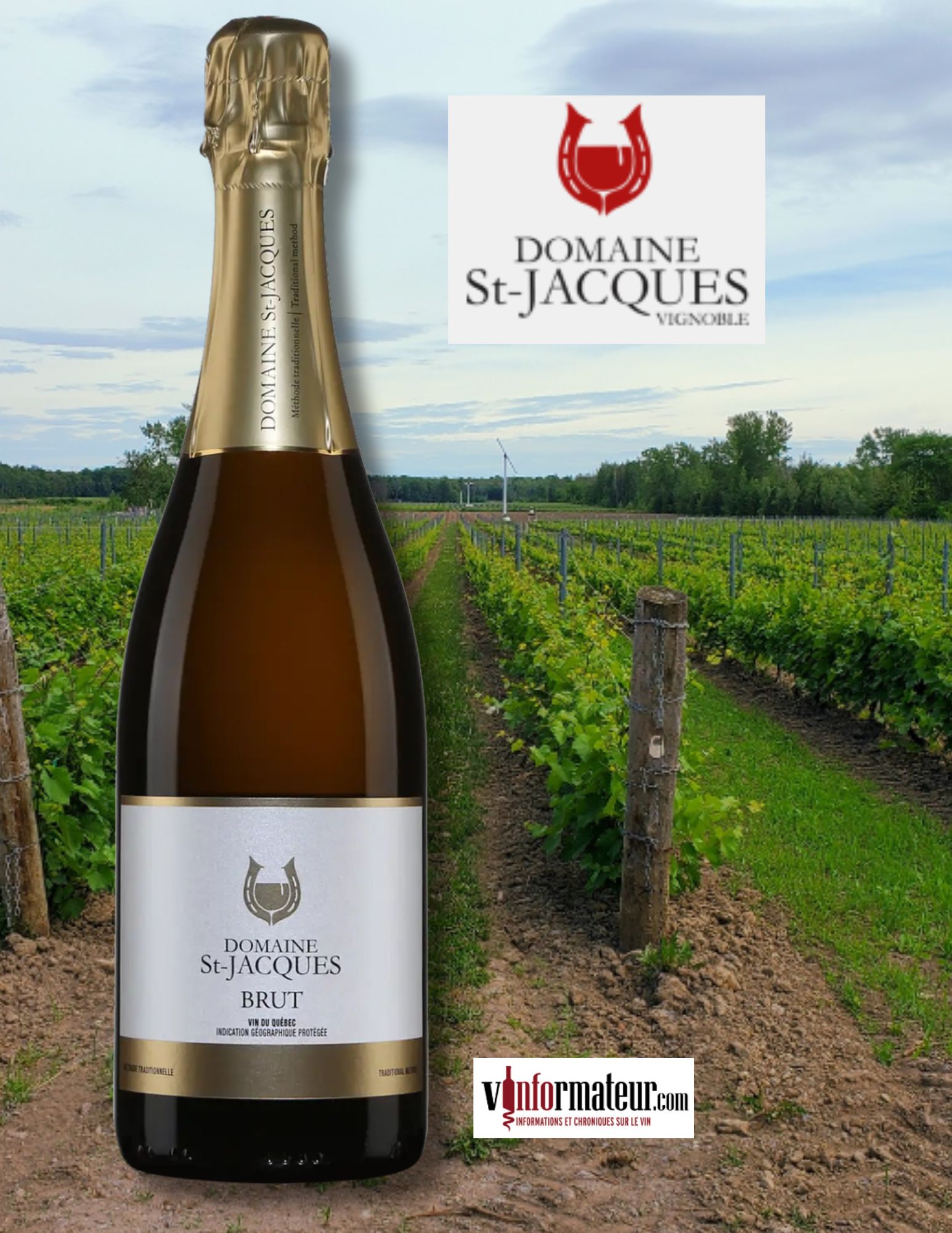Domaine St-Jacques, vin mousseux, Brut, en conversion bio, 2020, 35,25$, cépages : Chardonnay 50%, Vidal 50%, sucre : 6.9 g/l, alc. : 12.5%, code SAQ : 14721888.