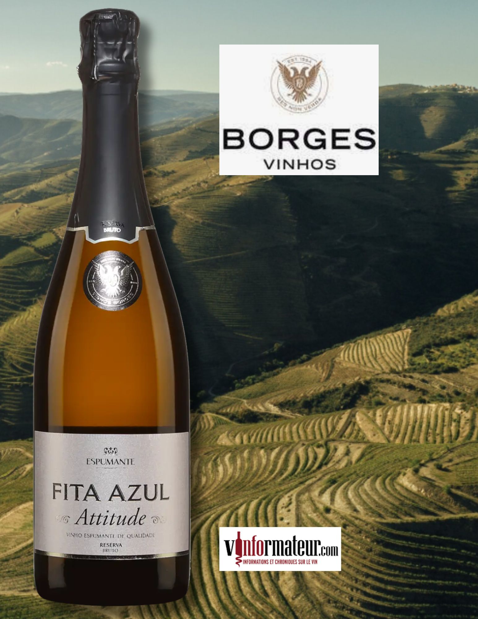 Fita Azul, Espumante, Attitude, Reserva, Brut, Portugal, Vinhos Borges, 14,00$, cépages : Gouveio 30 %, Malvasia fina 30 %, Arinto 20 %, Codega 20%, sucre : 8.7 g/l, alc. : 12%, code SAQ : 13640277.