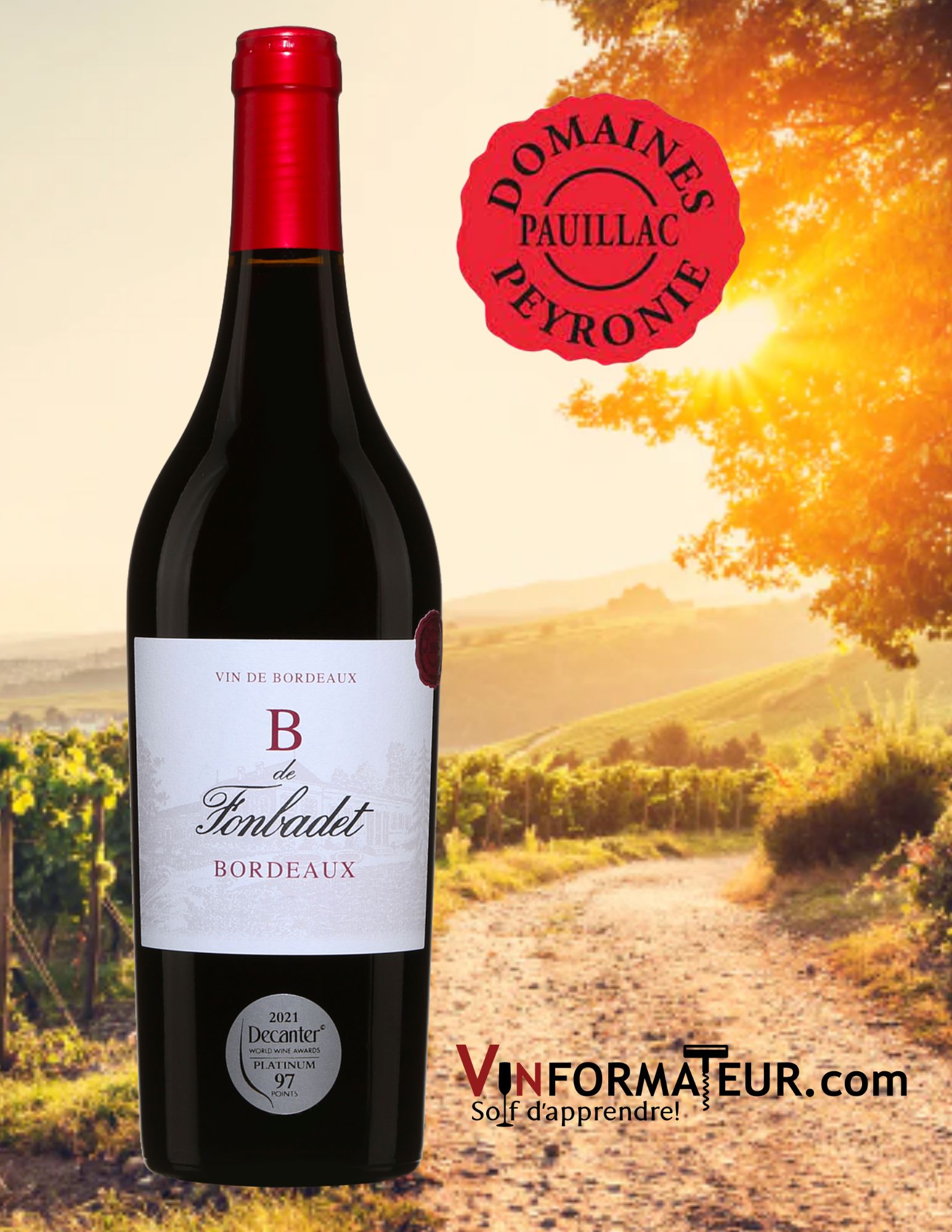 B de Fonbadet, Bordeaux, vin rouge, 2019, 20,05$, cépages : Cabernet franc 40 %, Cabernet-sauvignon 30 %, Merlot 30 %, sucre : 2.5 g/l, alc. : 13.5%, code SAQ : 15131530.