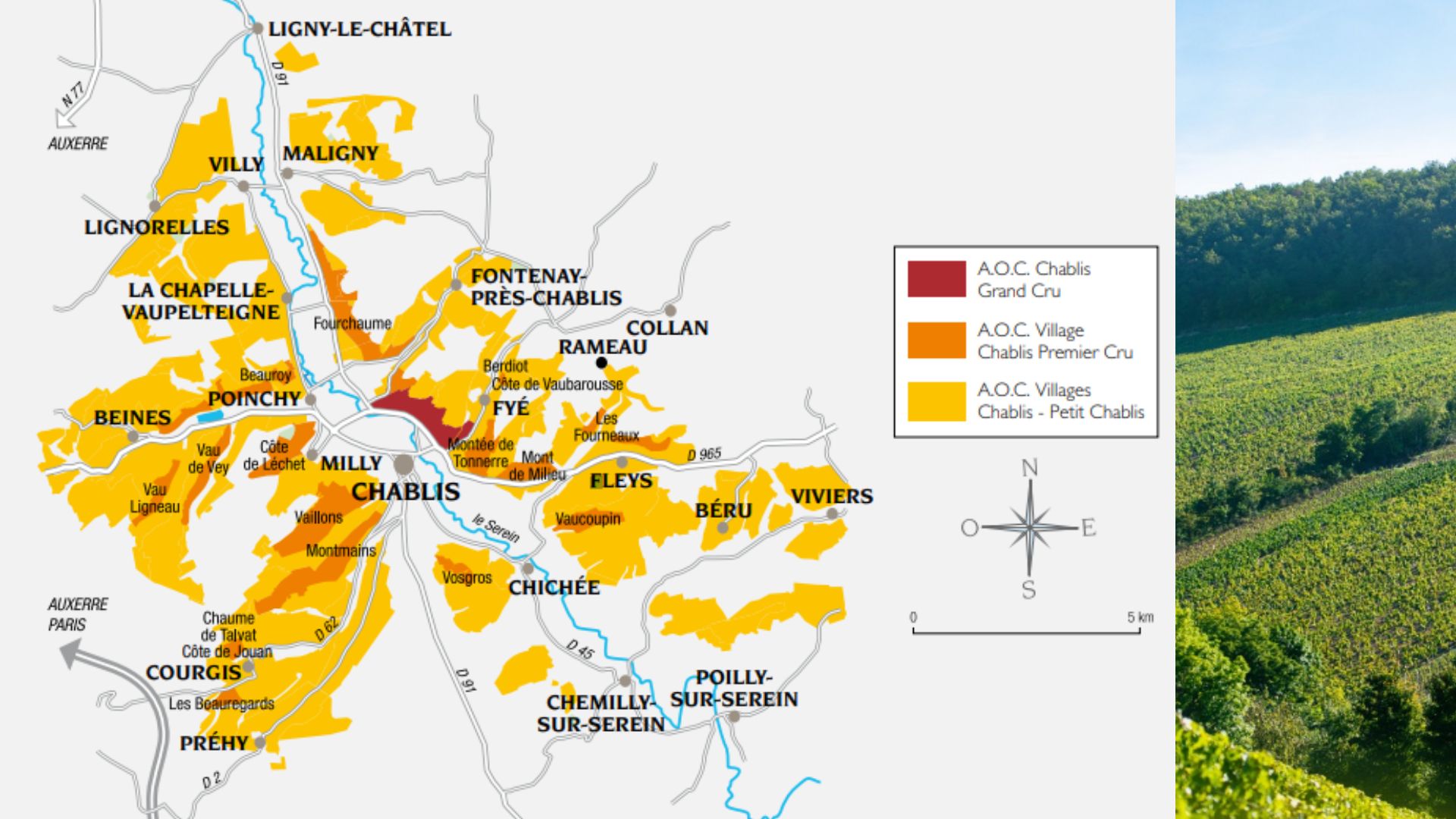 Ce vin provient de l’appellation Chablis l’une des quatre du vignoble chablisien (Petit Chablis, Village Premier Cru et Village Grand Cru). C’est la plus importante et représente 65% de la production avec ses 3,716 ha.