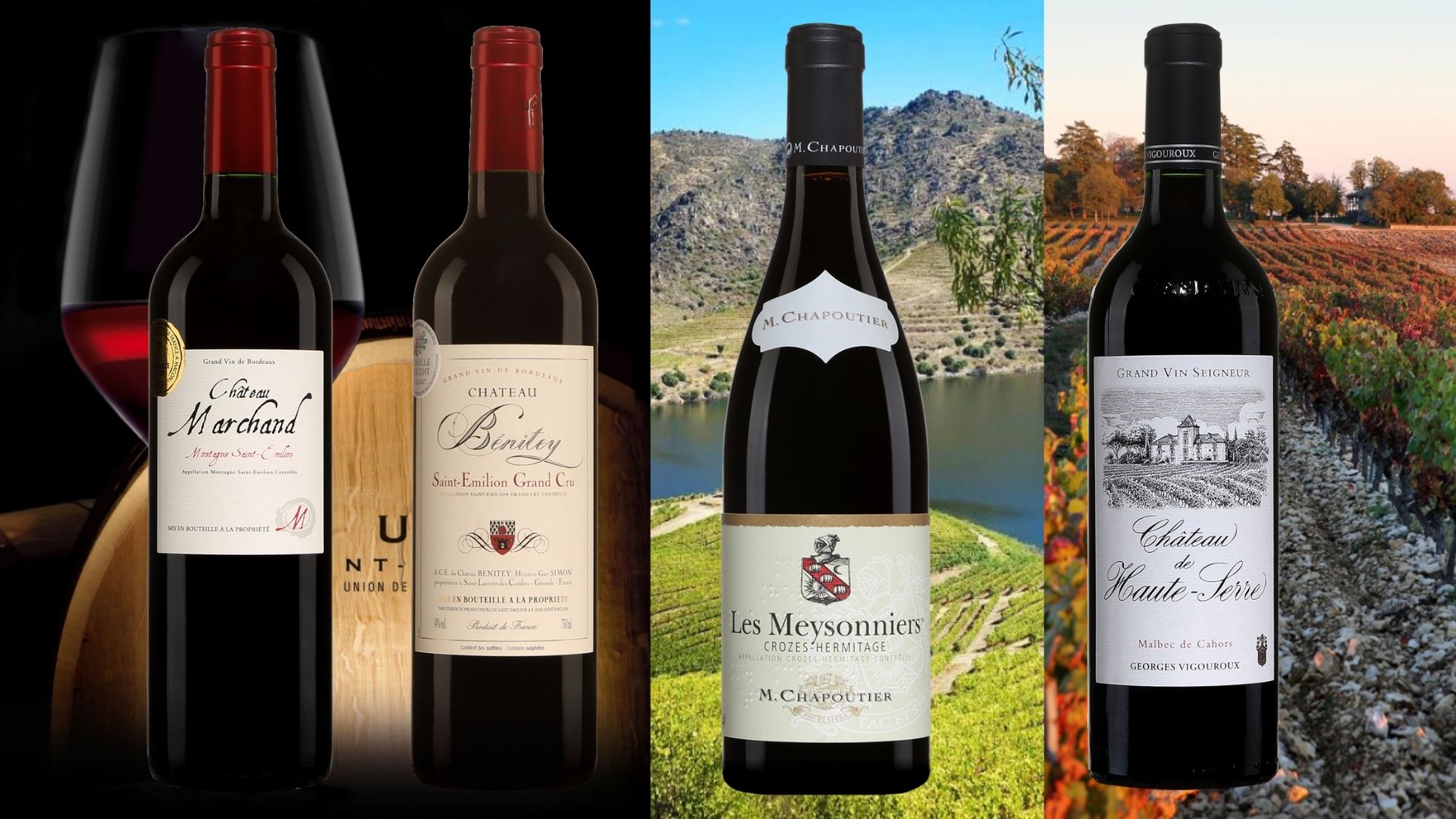 Je vous suggère quatre vins rouges de qualité de l’appellation Saint-Émilion dont un Montagne Saint-Émilion et un Grand Cru, de l’appellation Crozes-Hermitage une de mes préférées dans la Vallée du Rhône et de l’appellation Cahors avec un vin issu du Malbec.