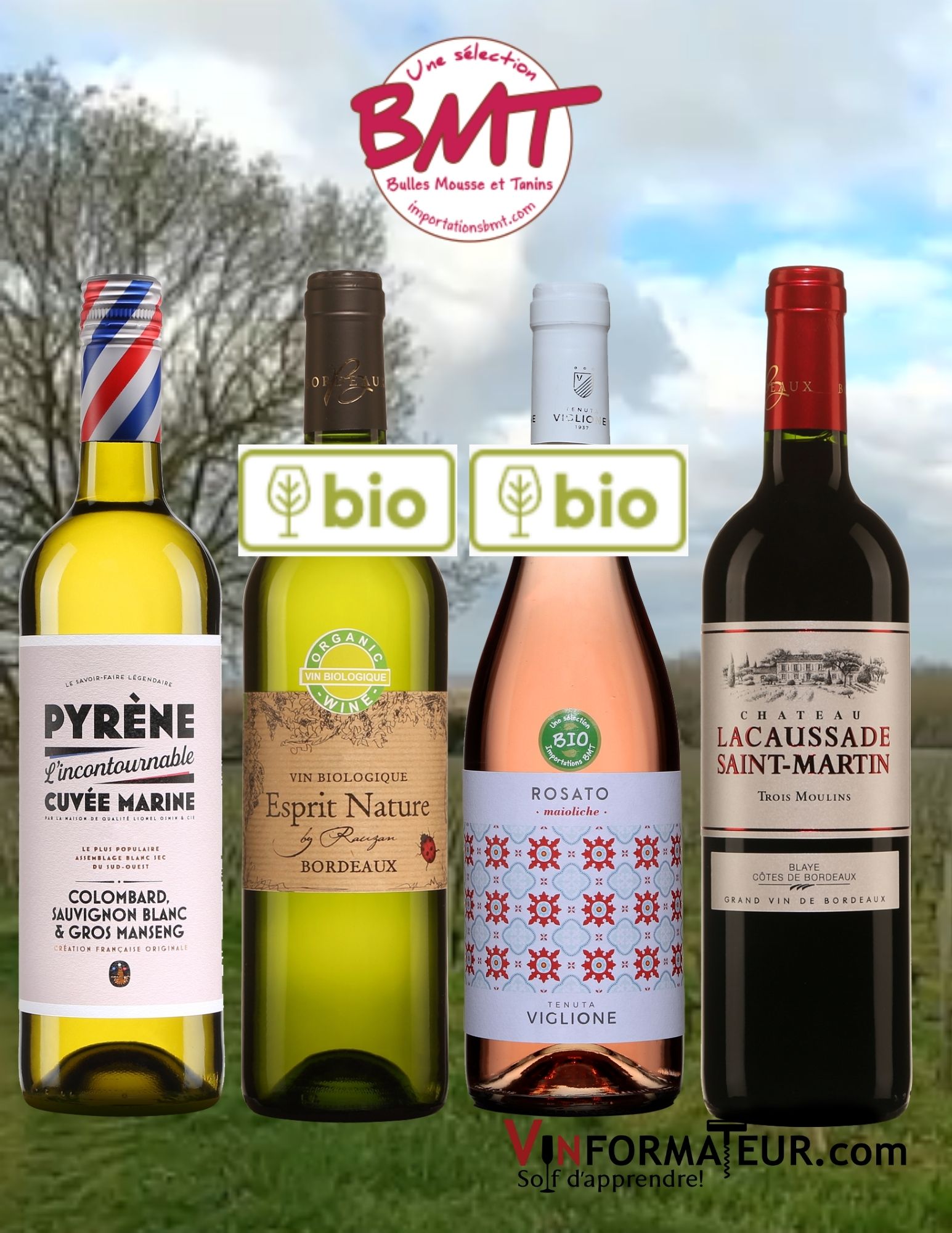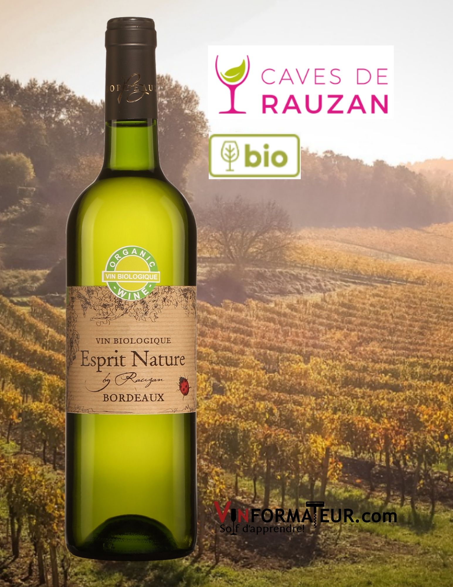 Esprit Nature, by Rauzan, France, Bordeaux, vin bio blanc, 2019, 17,30$, cépages: Sauvignon blanc 60 %, Sémillon 30 %, Muscadelle 10 %, sucre : moins de 1.2 g/l, alc. : 12%, code SAQ : 14408162.