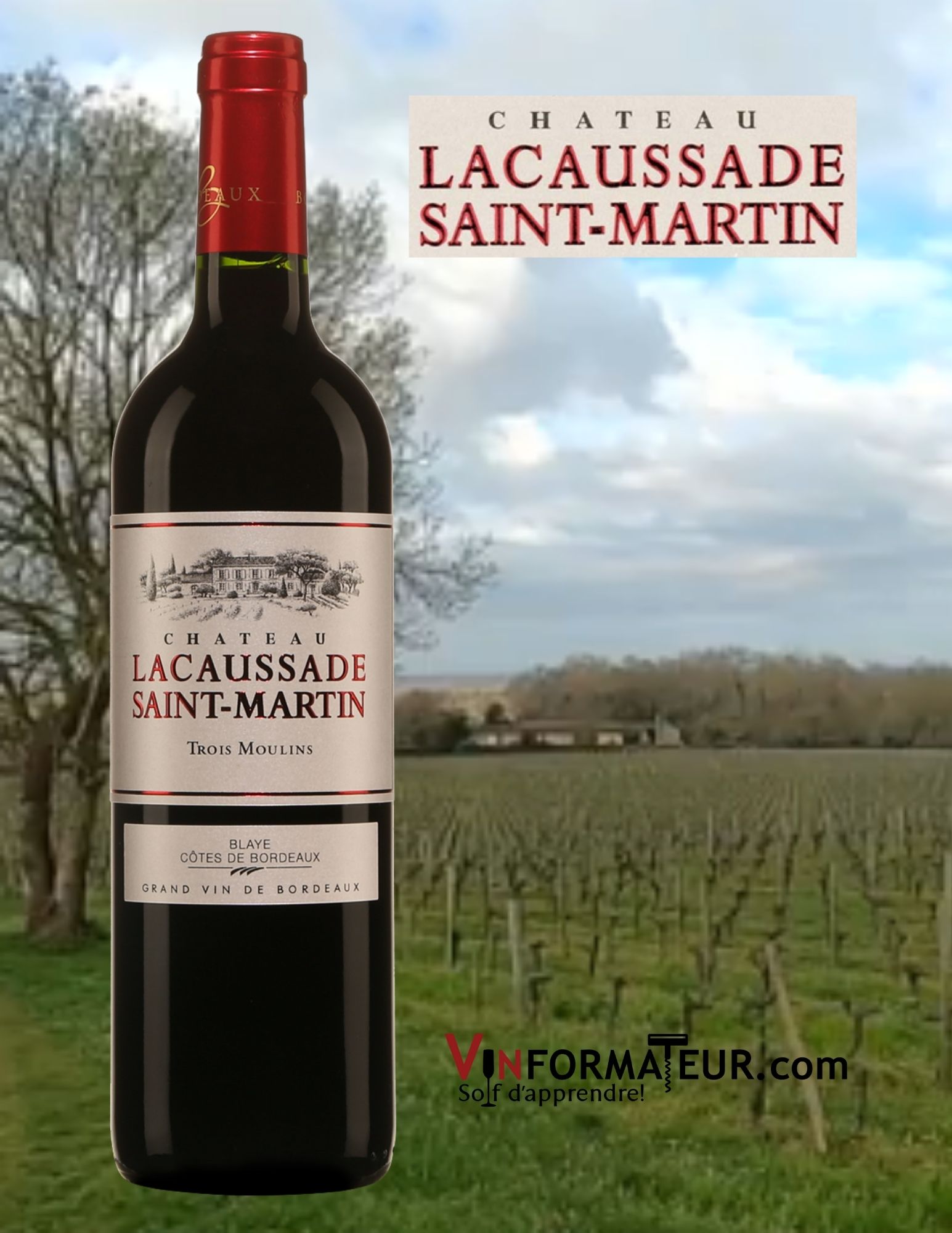 Château Lacaussade Saint-Martin, Trois Moulins, Blaye Côtes de Bordeaux, vin rouge, 2019, 20,45$, cépages : Merlot 80 %, Cabernet-sauvignon 15 %, Malbec 5 %, sucre : 2.9 g/l, alc. : 14%, code SAQ : 14146713.