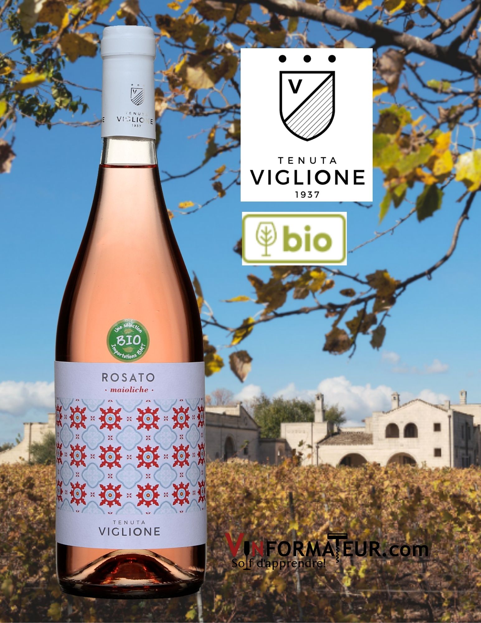 Rosato, Italie, Pouilles, vin rosé bio, Tenuta Viglione, Maioliche Collection, 2021, 20,05$, cépage : Primitivo 100%, sucre : 4.8 g/l, alc. : 13%, code SAQ : 14977226.