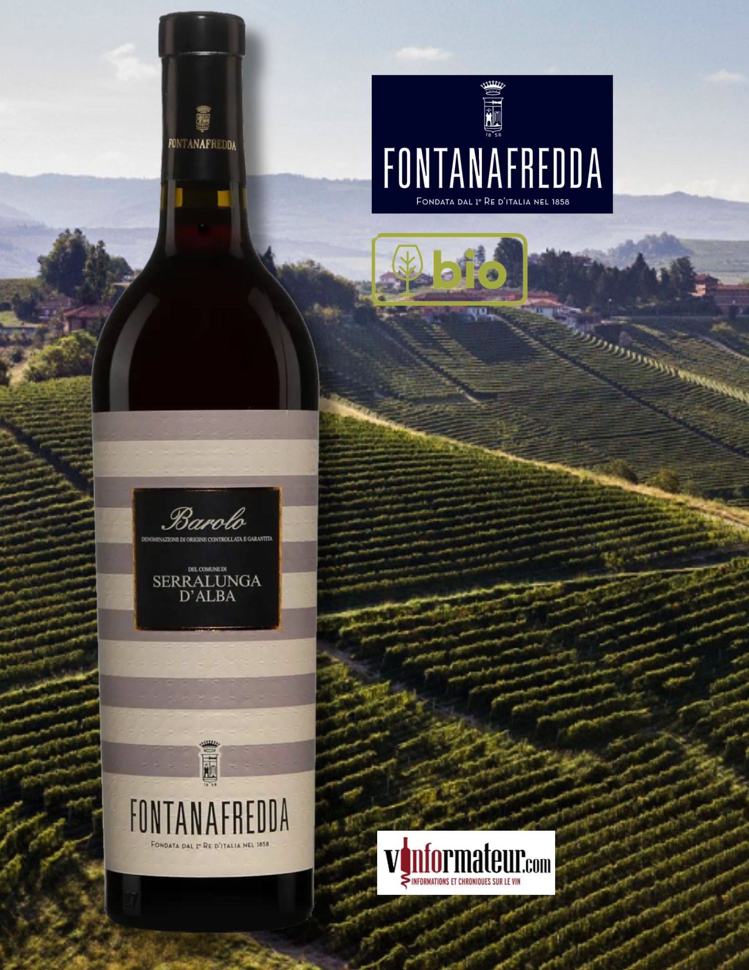 Née en 1858 de l’histoire d’amour entre le roi d’Italie, Vittorio Emanuele II, et Rosa Vercellana la maison Fontanafredda, le plus grand producteur privé de Barolo, élabore des vins iconiques à parti de 120 hectares de cultures bio répartis sur 5 crus de Barolo entre les municipalités de Serralunga d’Alba, Barolo, Diano d’Alba, Dogliani, Farigliano, Alba et Rodello, à des altitudes comprises entre 250 et 420 mètres d’altitude