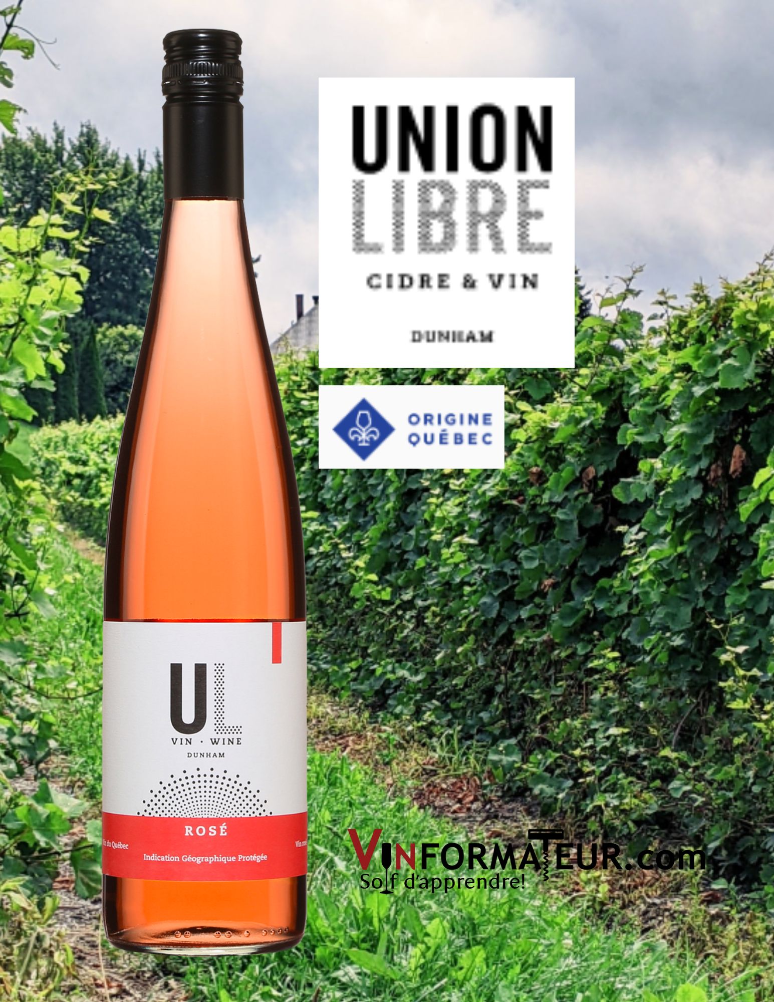Union Libre, vin rosé, Québec, Montérégie, 2022, 18,80$, cépages : Seyval Noir 75 %, Sainte-Croix 25 %, sucre : 4.5 g/l, alc. : 12%, code SAQ : 14378135.