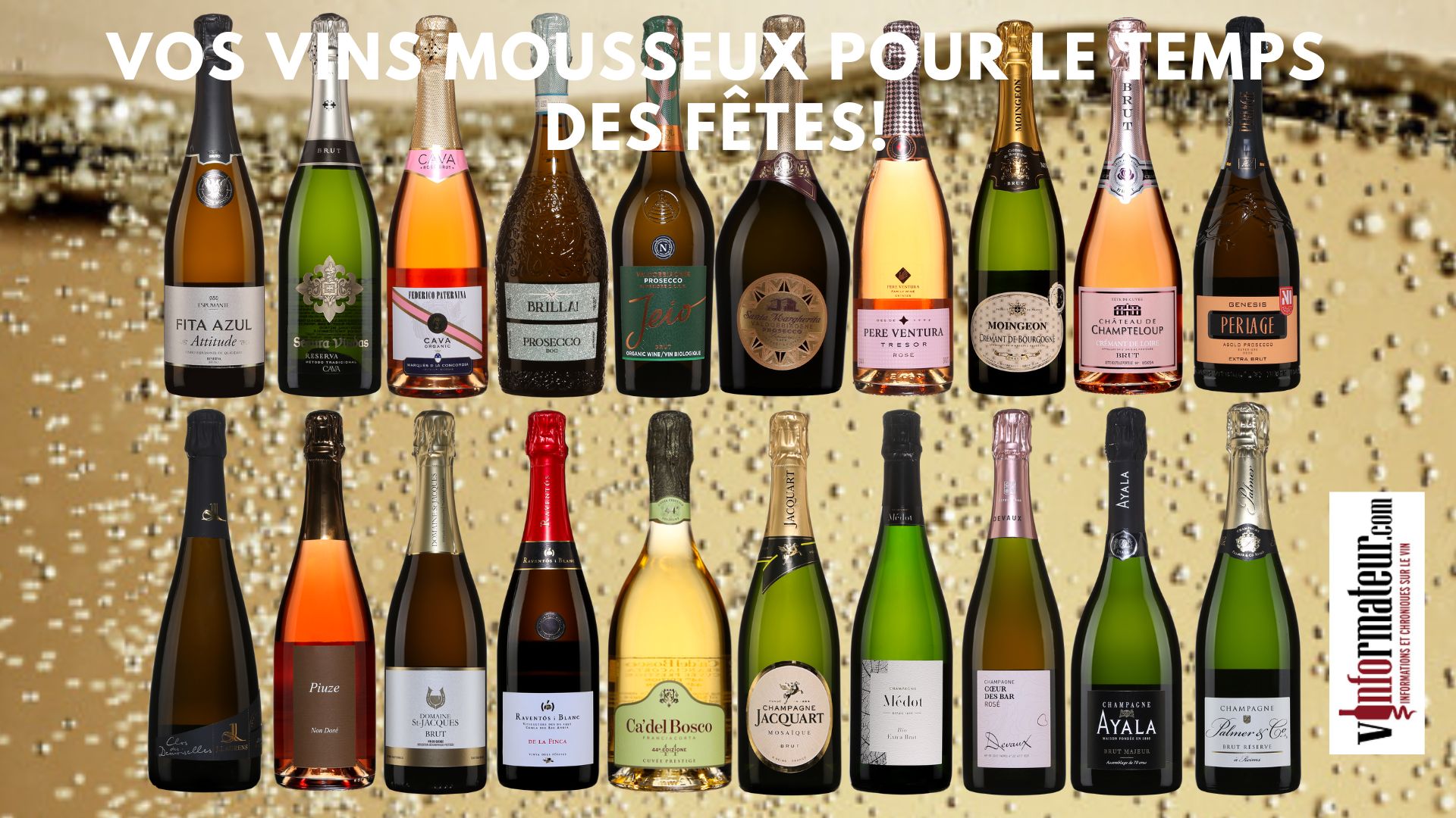 Fita Azul, Segura Viudas, Cava, Brut Rosé bio, Federico Paternina, Brilla! Prosecco, Jeio, Bisol, Santa Margherita, Pere Ventura, Tresor, Moingeon, Château de Champteloup, Perlage, Cuvée Genesis,Clos des Demoiselles, Piuze, Non Dosé , Domaine St-Jacques, Raventos I Blanc, Ca’del Bosco, Cuvée Prestige, Champagne Jacquart, Champagne Médot,Champagne Devaux, Champagne Ayala, Champagne Palmer bouteilles