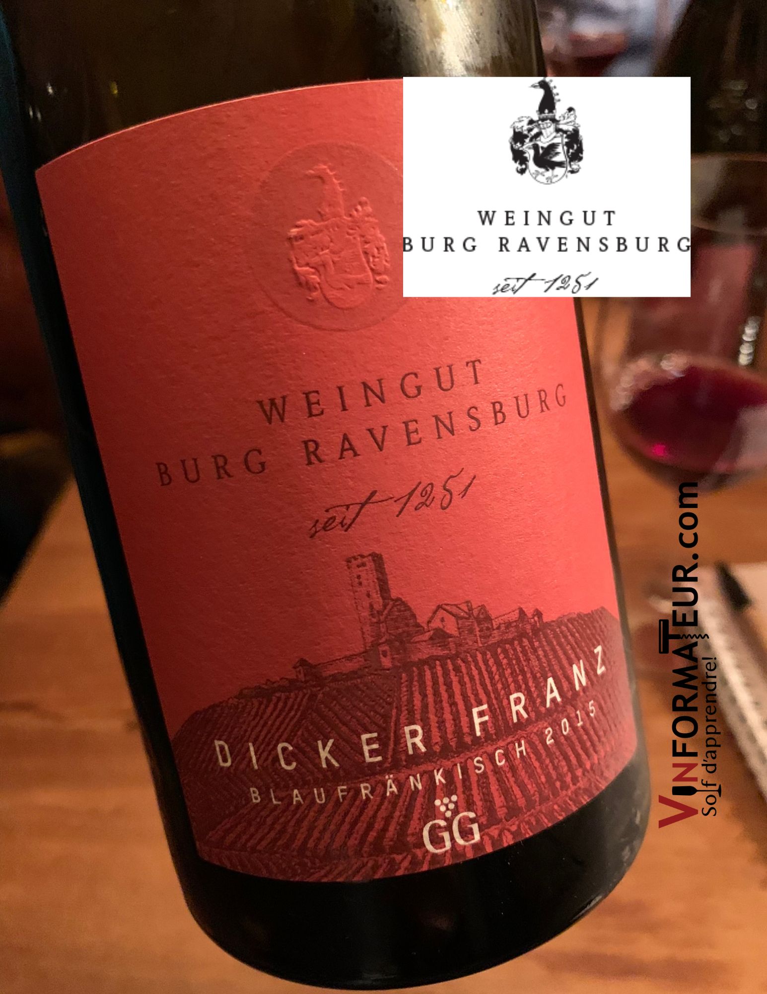 Dicker Franz, Blaufrankisch Jubilaumswein, Weingut Burg Ravensburg, Allemagne, Qualitatswein QbA, Grosses Gewächs, vin rouge bio, 2015, 49,00$, alc. : 13%, code SAQ : 14212725.