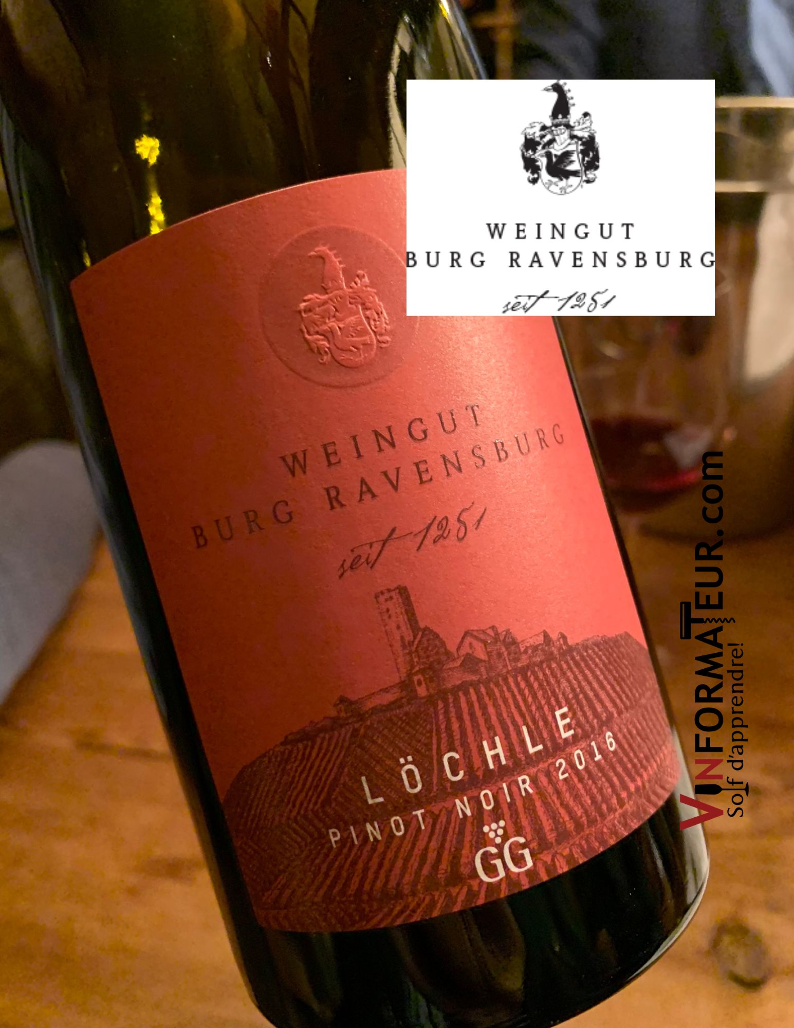 Pinot Noir, Weingut Burg Ravensburg, Allemagne, Baden Kraichgau, Lochle, VDP Grosse Lage, VDP Grosses Gewächs, vin rouge bio, 2016, 49,75$, sucre: 1.8 g/l, alc.: 12.5%, code SAQ: 14212709.