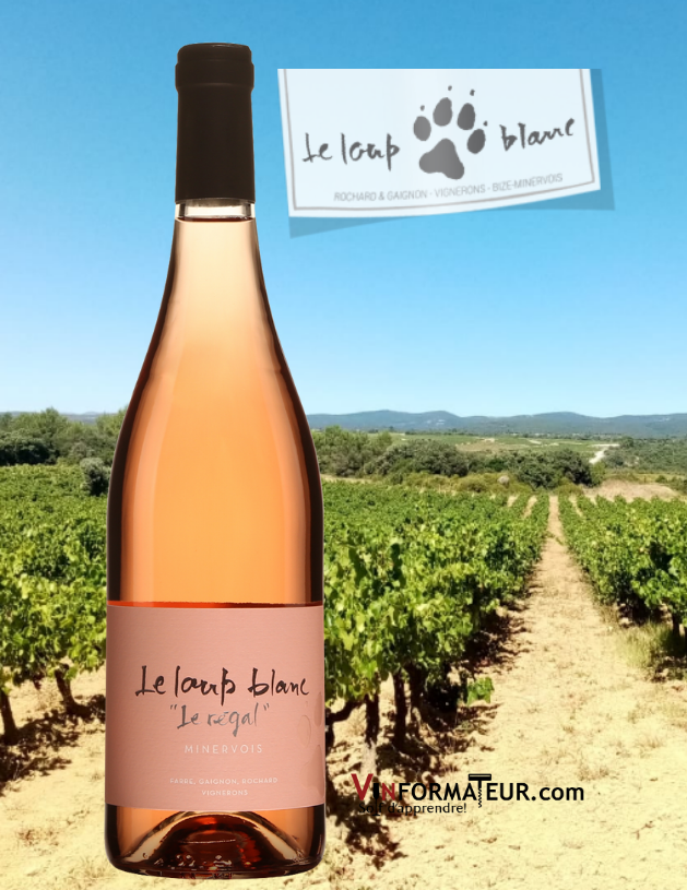 Le Loup Blanc, Le Régal, France, Languedoc-Roussillon, Minervois, vin rosé bio, 2020, 20,35$, cépages : Grenache 90 %, Cinsault 10 %, sucre : moins de 1.2 g/l, alc. : 13%, code SAQ : 12883429.