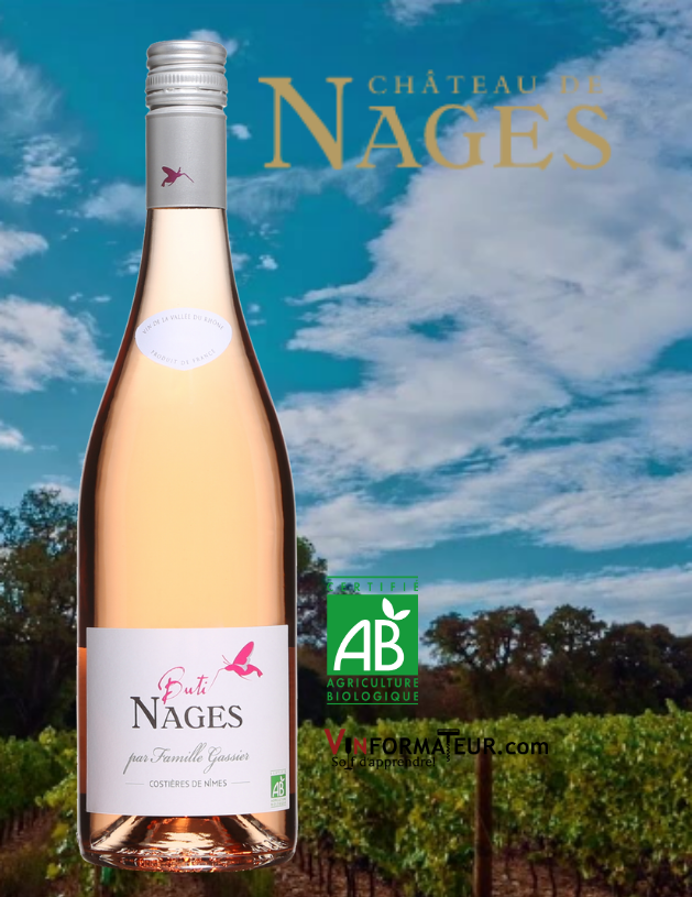 Buti, Nages, Vin Rosé Bio, Vallée du Rhône, Costières de Nîmes, Famille Gassier, 2020, 15,00$, cépages : Grenache Noir 80%, Syrah 20%, sucre : moins de 1.2g/l, alc. : 13.5%, code SAQ : 427625.
