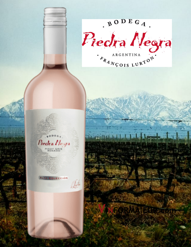 Piedra Negra, Pinot Gris Rosado, Alta Coleccion, Argentine, IG Los Chacayes, Valle de Uco, Mendoza, François Lurton, vin bio, 2020, 15,00$, sucre : moins de 1.2 g/l, alc. : 13%, code SAQ : 13964503.