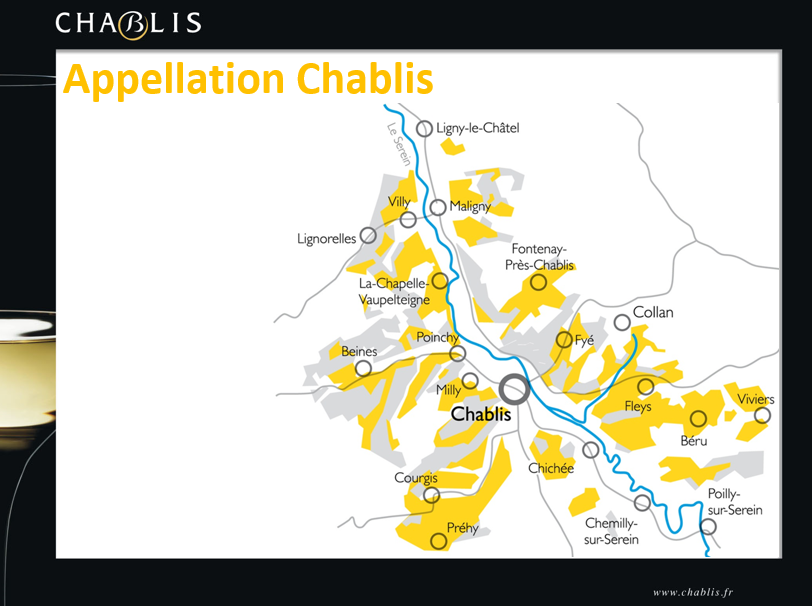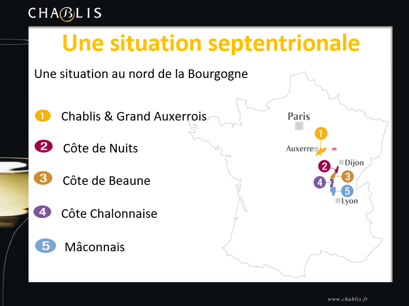 Bourgogne /Chablis : L’Appellation Chablis fait partie de la Bourgogne et est située dans le nord de la France. Elle représente environ 18% des vins de Bourgogne.