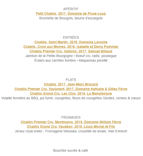 Nous étions conviés à une aventure champêtre orchestrée par le chef Marc-Olivier Frappier du Groupe Joe Beef et sa brigade du McKiernan. Les diverses appellations de Chablis ont été commentées par Grégory Viennois, directeur technique du Domaine Laroche et par Kler-Yann Bouteiller, ambassadeur des vins de Bourgogne et professeur de sommellerie à Québec.