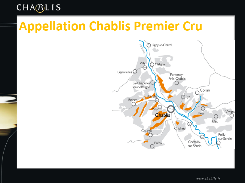 Les Appellations : Les vins de Chablis se déclinent en deux Appellations Village: Petit Chablis (19% du volume produit) et Chablis (66%), une Appellation Village Premier Cru (14%) et une Appellation Grand Cru (1%).