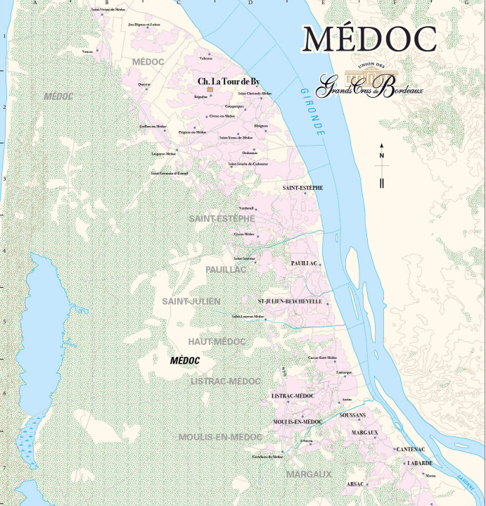 Le vignoble est réparti sur 2 grandes zones : A Bégadan, à 200m de la Gironde, 65 ha sur la croupe de graves de la Tour de By et à St Christoly, 44 ha se partageant entre croupe de graves et sol argilo-calcaire.