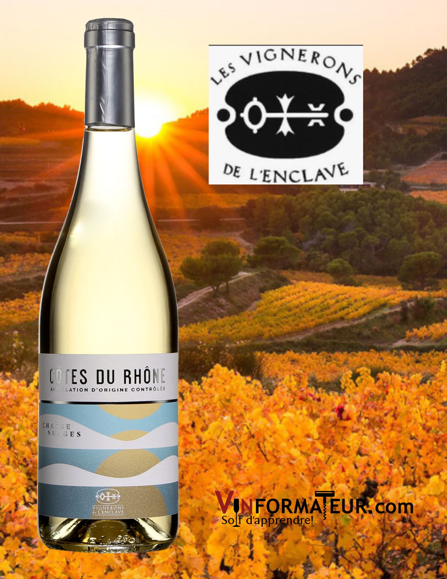 Chasse Nuages, AOC Côtes du Rhône, vin blanc, Vignerons de l’Enclave, 2021, 16,55$, cépages : Grenache blanc 50%, Viognier 50%, sucre : 1.4 g/l, alc. : 14%, code SAQ : 14737775.