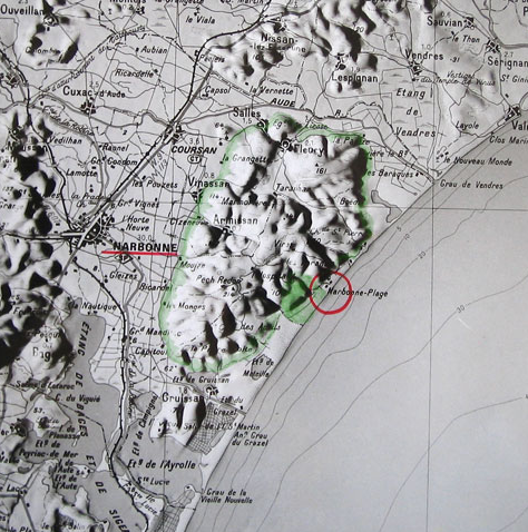 Situé dans l’Aude, le terroir de La Clape s’étend entre Narbonne et la Méditerranée, sur dix-sept kilomètres de long et sept kilomètres de large. Bordé à l’est par la mer, à l’ouest par les basses plaines alluviales de l’Aude et au sud par les étangs, il culmine à 214 mètres avec le Pech-Redon. Ce massif se caractérise par ses hautes falaises dominant l’horizon marin, ses canyons et vallons couverts de pinèdes, vignes et garrigues.