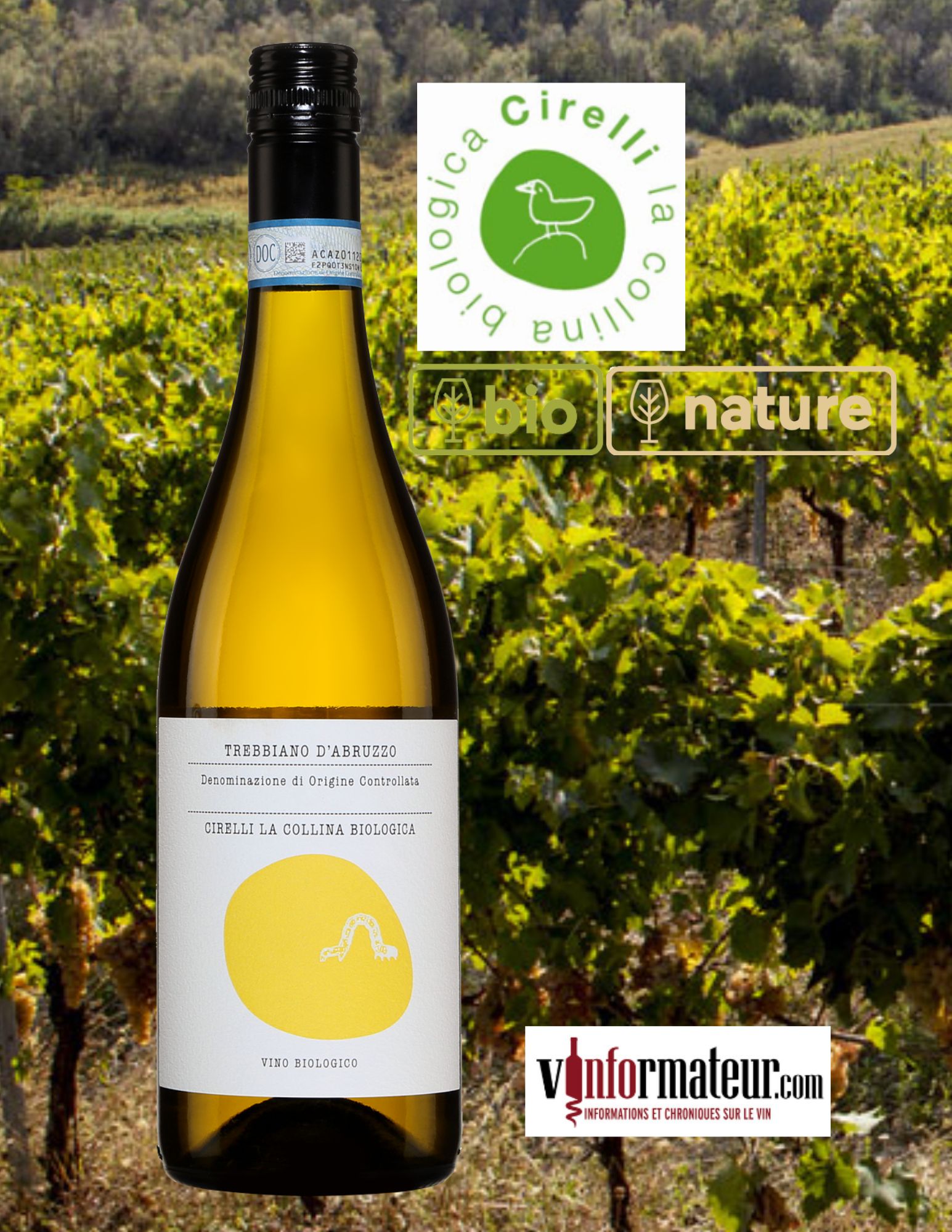 Francesco Cirelli, Cirelli La Collina Biologica, Trebbiano d’Abruzzo DOC, vin blanc bio et nature, 2022, 21,95$, sucre: moins de 1.2 g/l, alc.: 12%, code SAQ : 13750062.