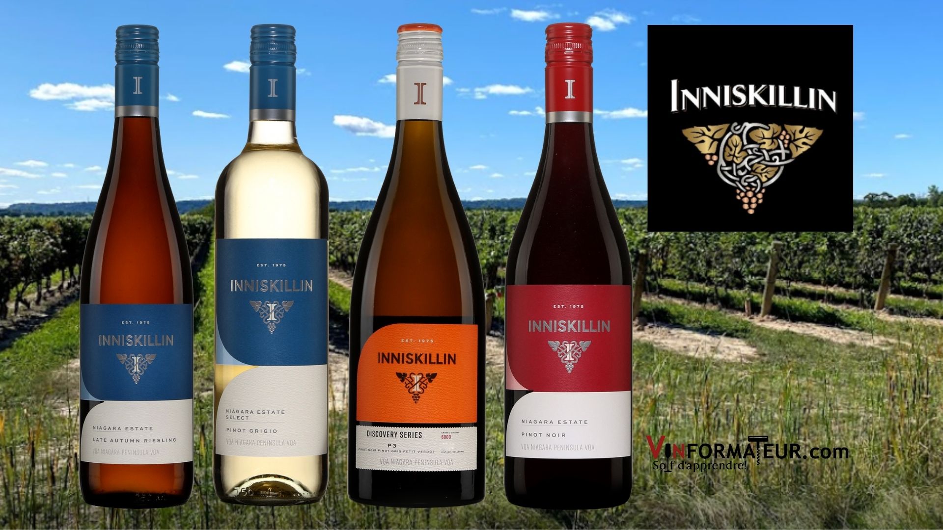 Inniskillin: Late Autumn, Riesling, 2020, Pinot Grigio, 2021, P3, Discoveries Series, 2021 et Pinot Noir 2020 .