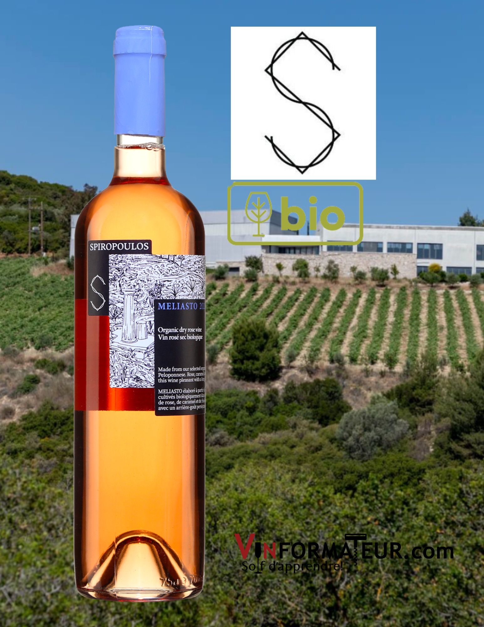 Ktima Spiropoulos, Meliasto, vin rosé bio, Grèce, Péloponèse, 2021, 18,90$, cépages : Moschophilero 93 %, Agiorgitiko 7 %, alc.: 12.5, code SAQ: 15057659.
