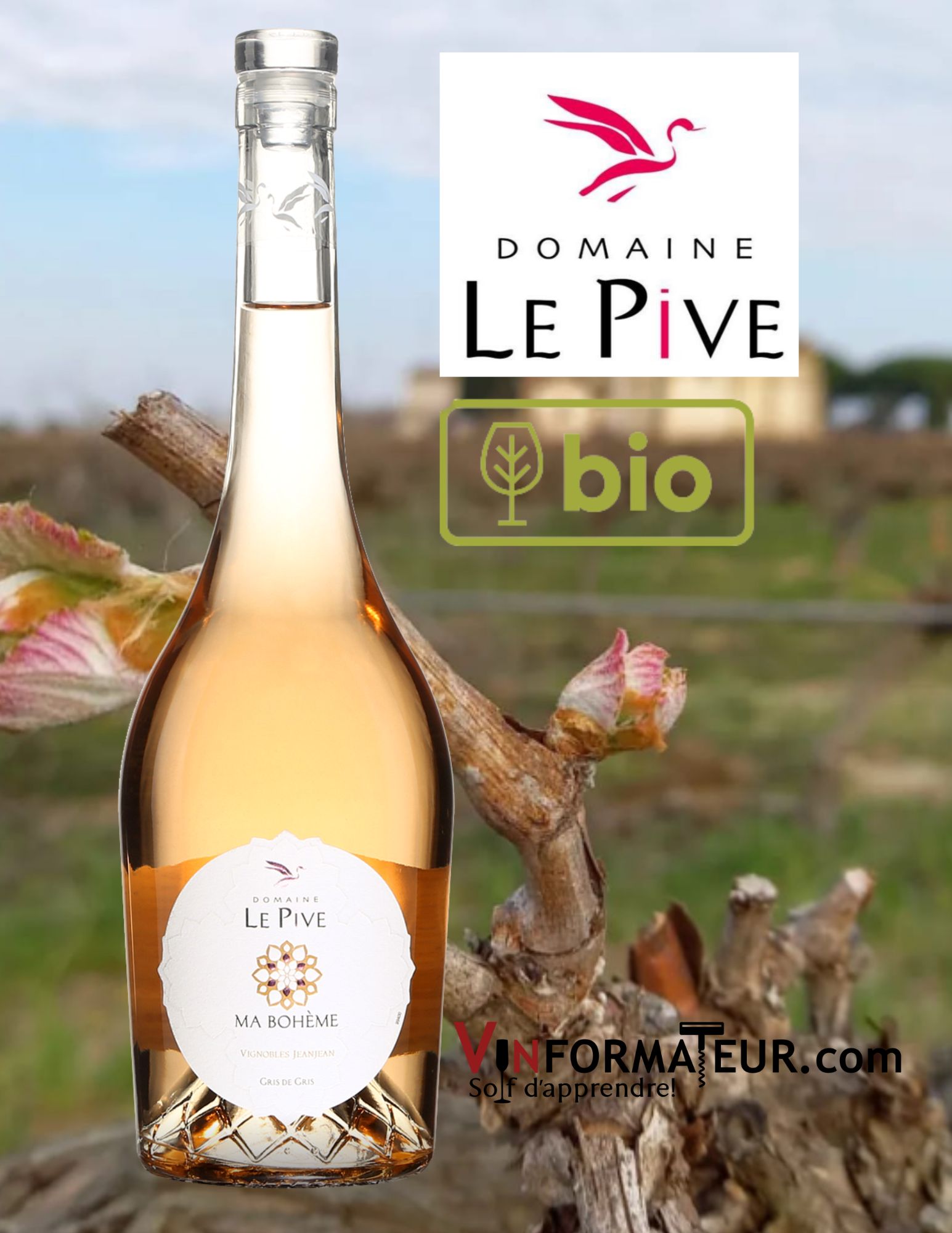 Ma Bohème, Domaine Le Pive, Vin rosé bio/vegan Gris de Gris, Languedoc-Roussillon, appellation Sable de Camargue, 2021, 21,00$, cépage : 100% Gris de Gris (Grenache Gris), sucre : moins de 1.2 g/l, alc. : 12%, code SAQ : 12883672.