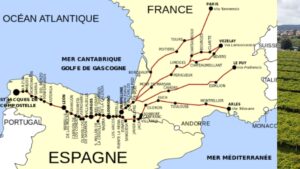 Une des plus importantes est la fameuse route de Saint Jacques de Compostelle. Cette route était en fait composée de centaines de routes au travers l’Europe. Elle était empruntée par les pèlerins et convergeait vers Saint Jacques de Compostelle (nord-ouest de l’Espagne) lieu ou étaient exhumés les restes de Saint Jacques. Cette route passait entre autres par Longrono ville importante (capitale) de la Rioja. L’impact de cette route a été des plus important pour le développement économique et culturel de la région.