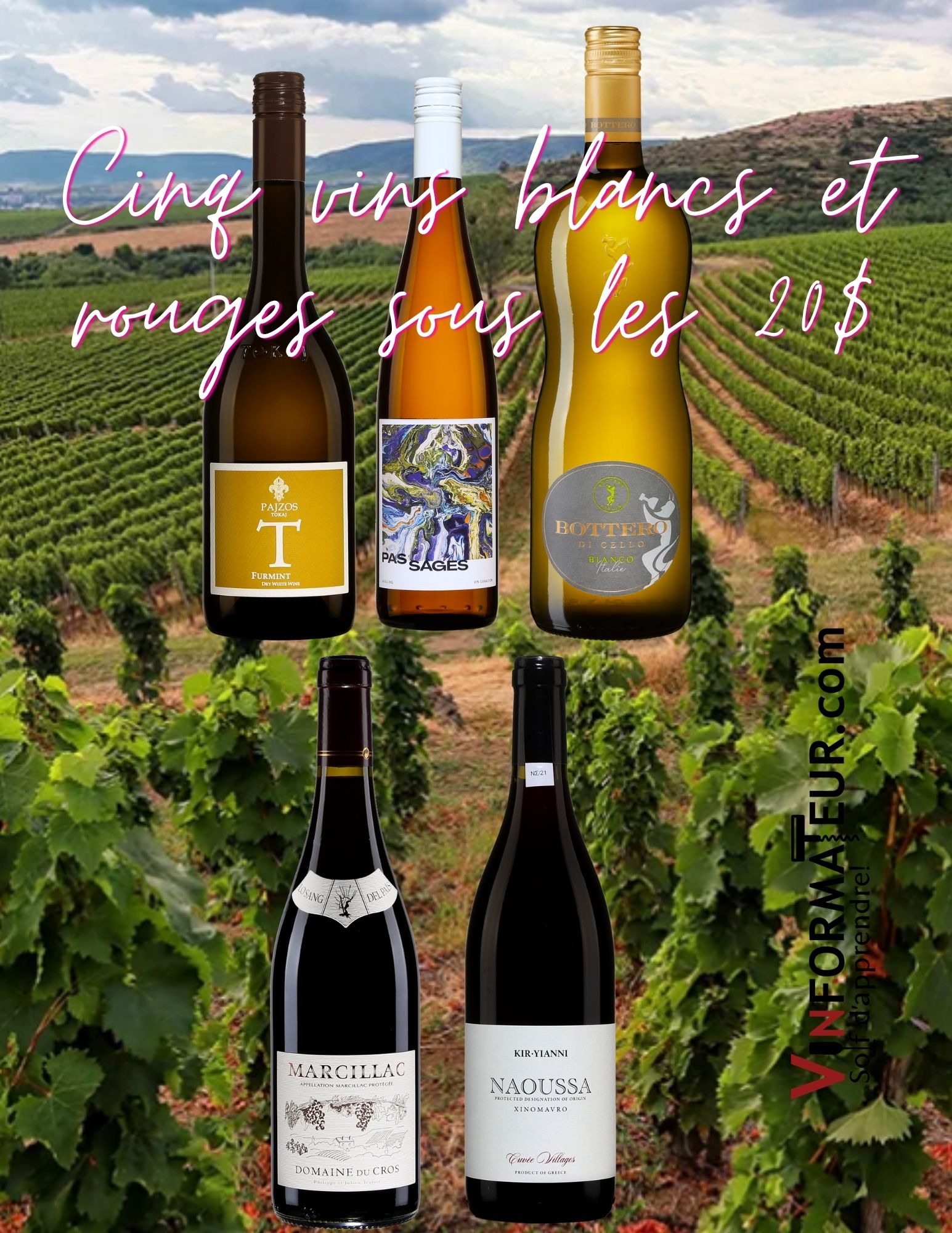 Voici donc 5 vins de 5 pays différents dont 3 blancs et 2 rouges vendus sous la barre des 20$. D’Italie, de Hongrie, du Canada, de Grèce et de France vous ferez un tour du monde vinicole!!