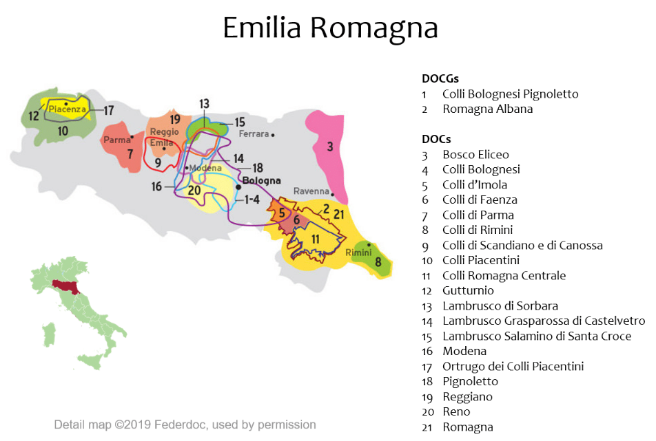 En plus de l’appellation Lambrusco DOC il existe d’autres appellations qui produisent des variances de lambrusco (avec dans certains cas des ajouts d’autres cépages) : Lambrusco di Sorbara (donne les vins les plus pâles), Lambrusco Grasparossa di Castelvetro (les plus corsés) et le Lambrusco Salamino di Santa Croce, Lambrusco Reggiano et Lambrusco di Modena. On le retrouve surtout dans la région de Parma, de Reggio Emilia et de Modena.
