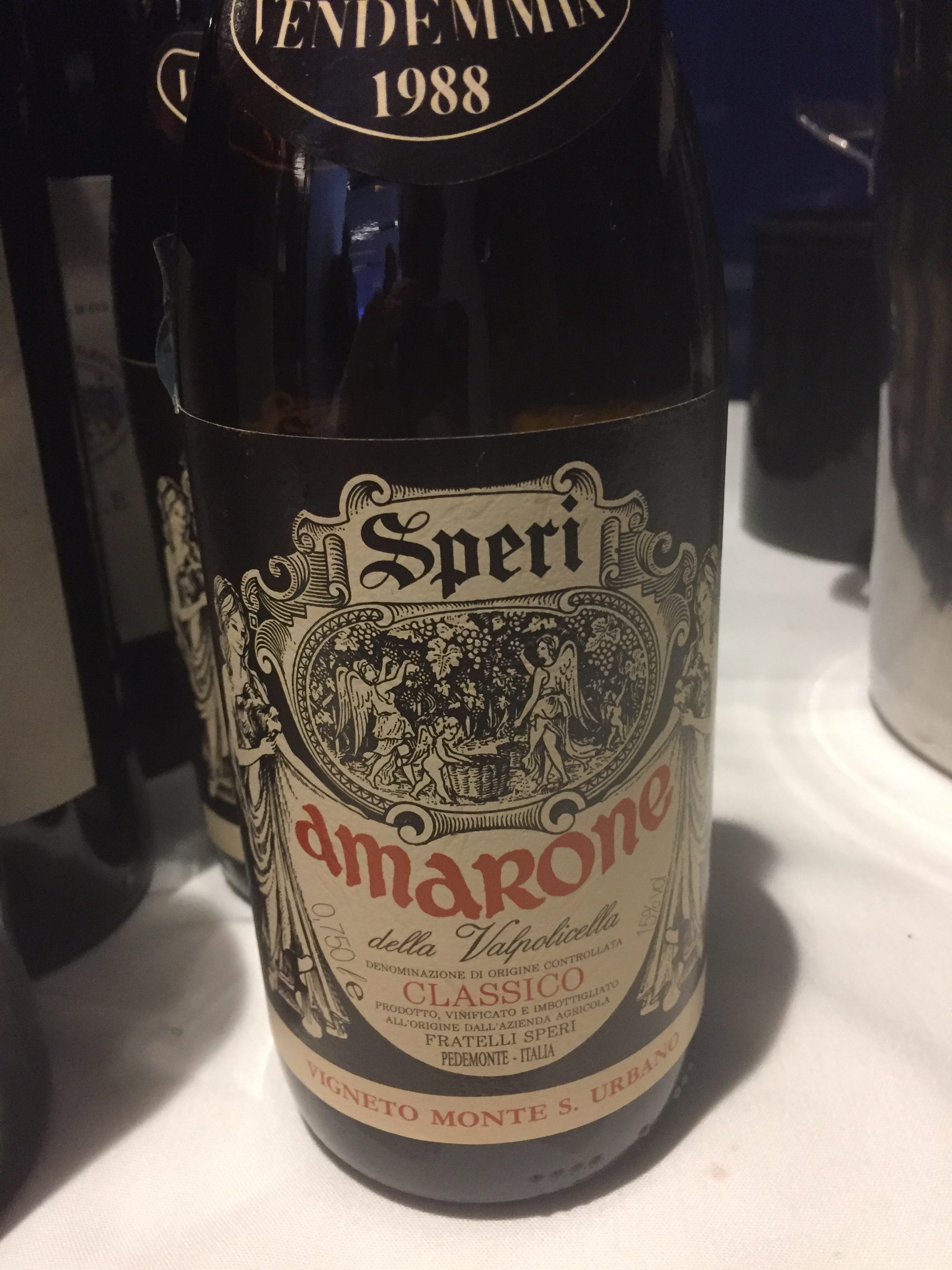 Speri Viticoltori, Vigneto Monte Sant’Urbano, Amarone della Valpolicella, 1988. Un de mes préférés qui, malheureusement, n’est pas disponible au Québec pour le moment. Ce vin a 30 ans…et en pleine forme! Des notes d’épices, des notes animales, viand.es, des notes de raisins secs et de prunes. En bouche ce qui surprend c’est son velouté, la fraîcheur de son acidité et les tannins bien serrés encore et bien présents. En bouche, de belles notes de raisins secs et de prunes. Belle concentration, beaucoup d’équilibre et de l’élégance à en revendre.