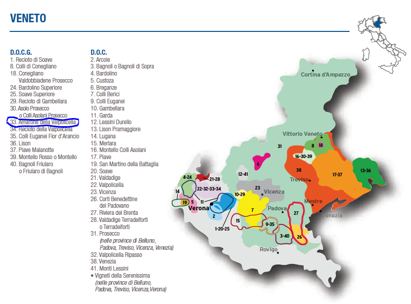 Tout d’abord, il faut savoir que l’Amarone provient de la Vénitie de la région de la Valpolicella. C’est en fait une appellation DOCG (depuis 2010) : Amarone della Valpolicella (Classico – Valpantena) et Amarone della Valpolicella Riserva (Classico – Valpantena). On y produit des vins très haut de gamme dans la lignée des Barolo et des Brunello di Montalcino. Ces vins ne sont pas donnés; leur haut niveau de qualité, leur réputation et aussi leur processus complexe de vinification en justifient le prix.